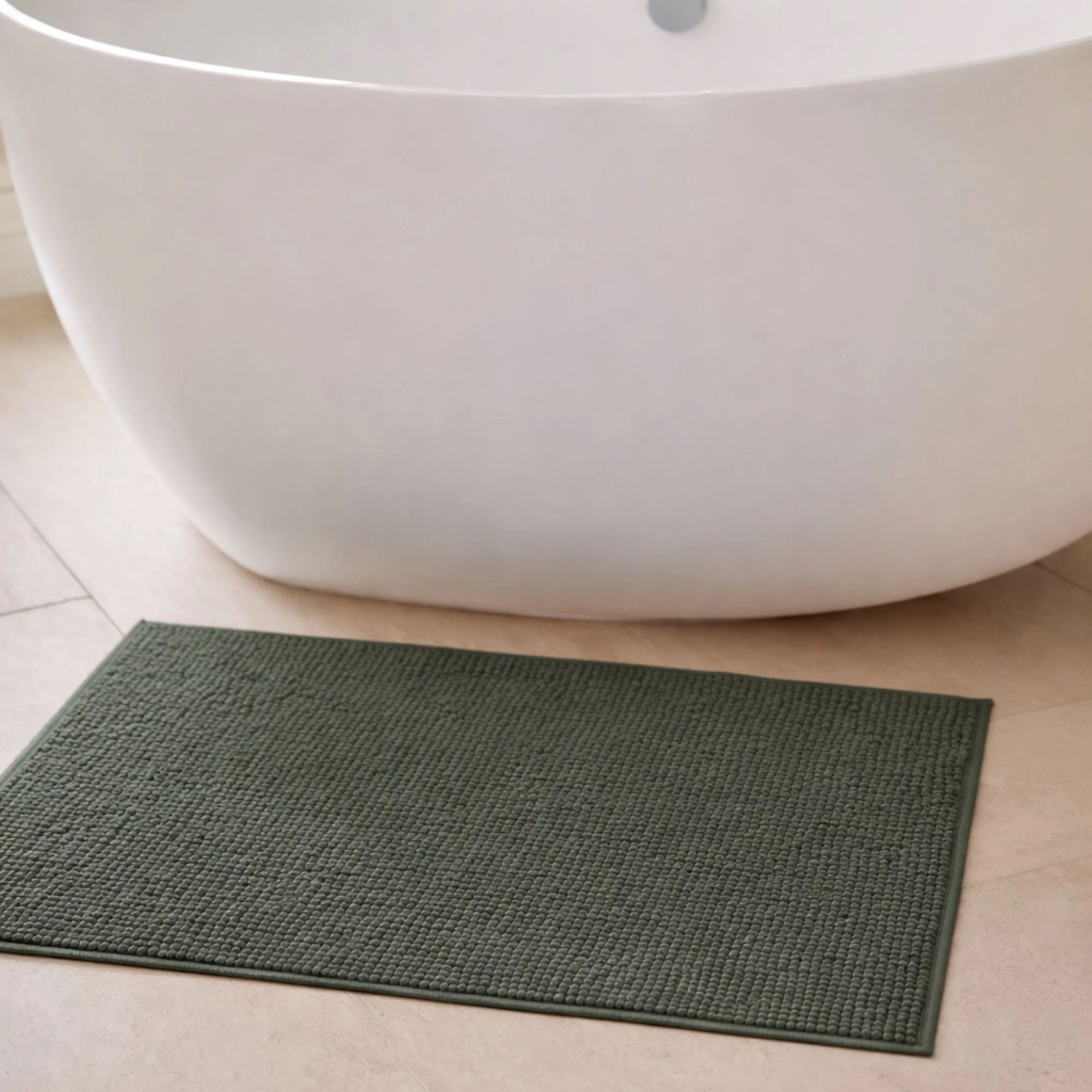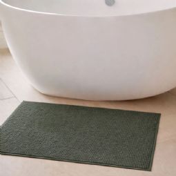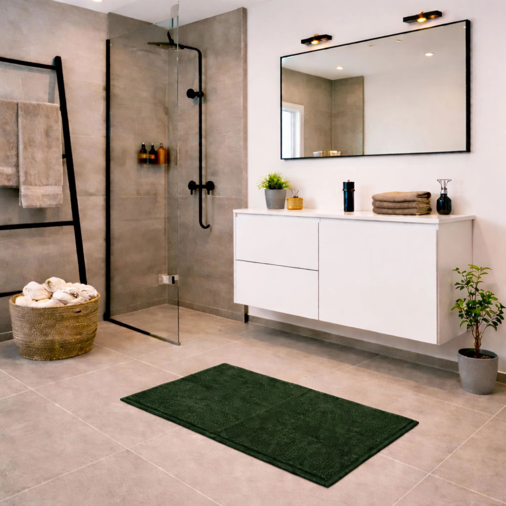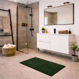 Giv dit badeværelse et stilrent og moderne løft med denne elegante bademåtte i klassisk grøn. Den enkle farve skaber et roligt udtryk og passer perfekt ind i både lyse og mørke badeværelser. Den bløde overflade i 100% polyester føles behagelig under fødderne og giver en komfortabel start på dagen. Samtidig absorberer måtten fugt effektivt og hjælper med at holde gulvet tørt efter badet. Bademåtten er perfekt til hverdagen - den slidstærke kvalitet gør den modstandsdygtig over for gentagen brug og vask, så den bevarer både form og udseende over tid. Den skridsikre bagside i SEBS sikrer, at måtten ligger stabilt på gulvet og giver ekstra tryghed i badeværelset. En praktisk og stilfuld løsning, der kombinerer komfort, funktion og holdbarhed i én.
