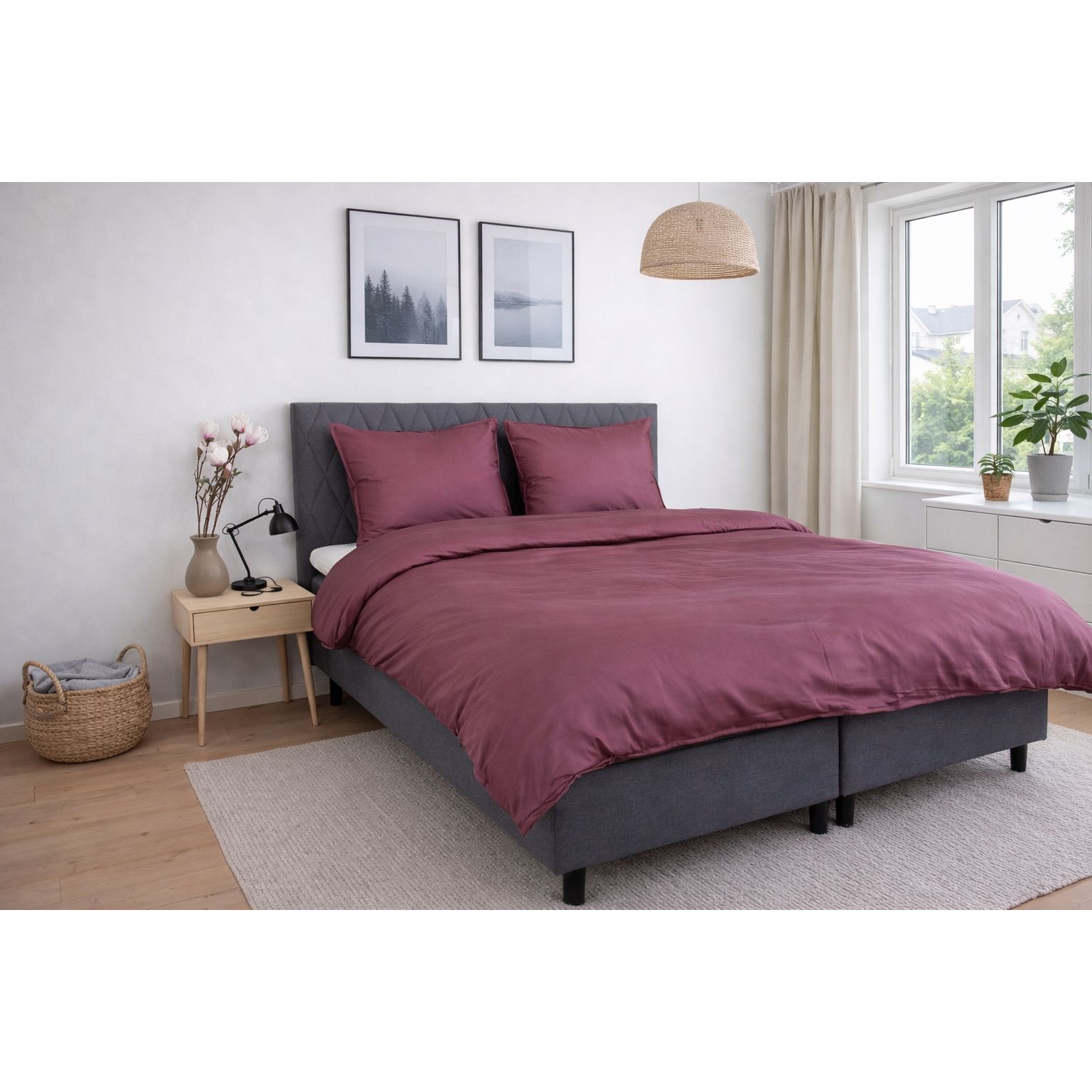 Det ensfarvede design i bordeaux giver et roligt, elegant og tidløst udtryk, der passer ind i enhver indretning. Dynebetrækket lukkes med lynlås, mens pudebetrækket har overlap, hvilket sikrer en pæn finish og god funktion i hverdagen.