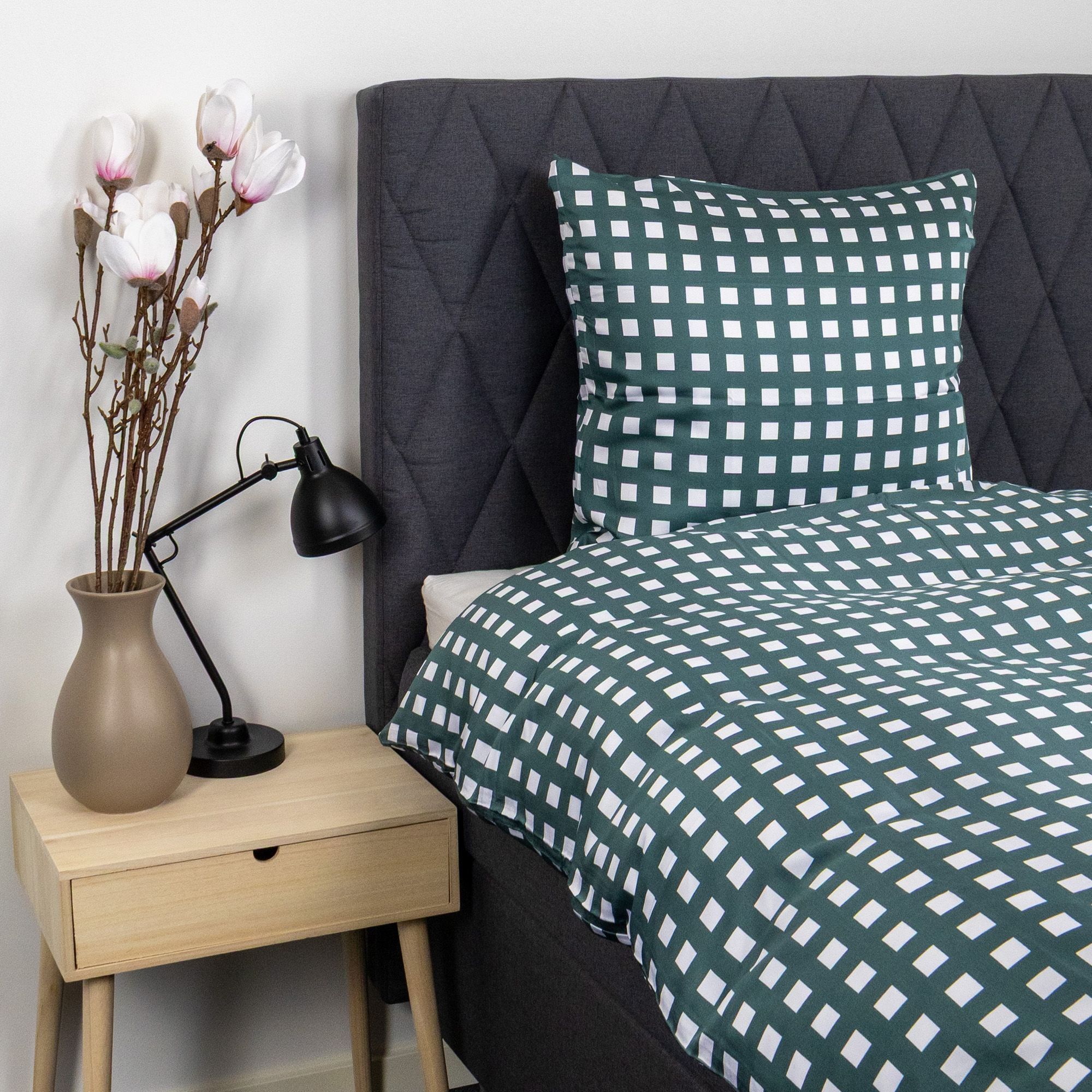 Oplev en ny standard indenfor komfort med dette bambus sengetøj i grønne og hvide tern. Det klassiske ternede design giver et stilrent og tidløst udtryk, der passer perfekt ind i både moderne og nordiske soveværelser. Samtidig får du en silkeblød kvalitet, der løfter din nattesøvn til et helt nyt niveau.