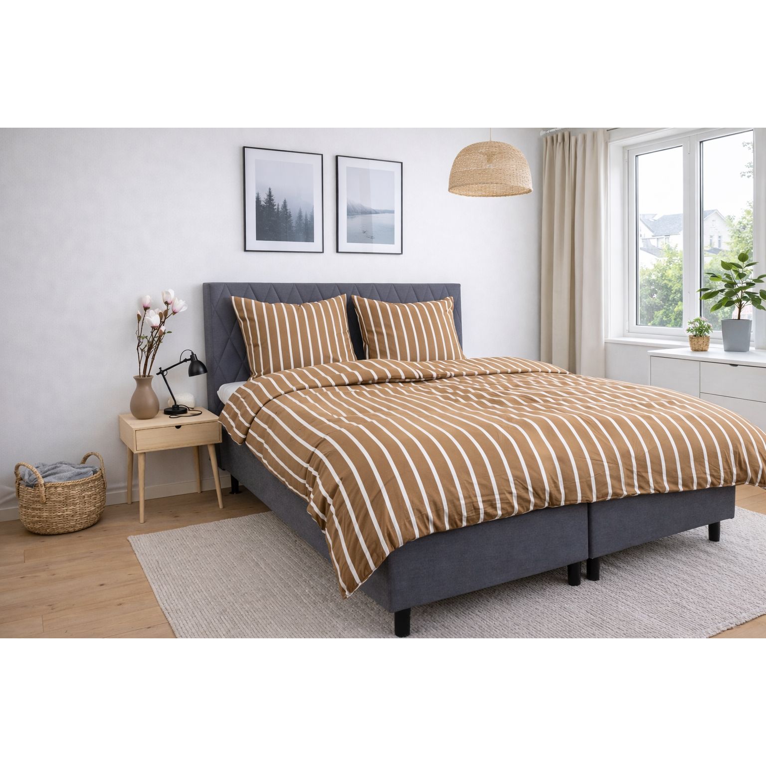 Bambus sengetøj med beige striber