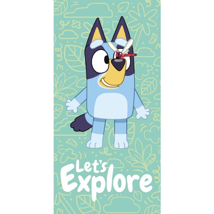Blødt badehåndklæde i 100% bomuld, med et sødt motiv af Bluey - Let's Explore. Håndklædets søde motiv, vil helt sikkert bringe et smil frem på den lille fan, så badetid bliver sjovere. Balancen i naturlig komfort fra det bløde materiale og det hyggelige Bluey design, gør dette håndklæde til en sikker favorit hos dit barn.
