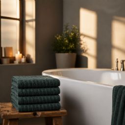 Opgrader dit badeværelse med disse stilfulde badehåndklæder i en mørkegrøn nuance, der tilfører ro og elegance til indretningen. Det klassiske og enkelte design giver et tidløst udtryk, som passer perfekt ind i både moderne og traditionelle hjem. Badehåndklæderne er fremstillet i 100% kæmmet bomuld, hvor de finere og længere fibre giver en ekstra blød og glat overflade. Resultatet er en behagelig kvalitet, der føles skånsom mod huden og samtidig sikrer en effektiv absorbering i hverdagen.