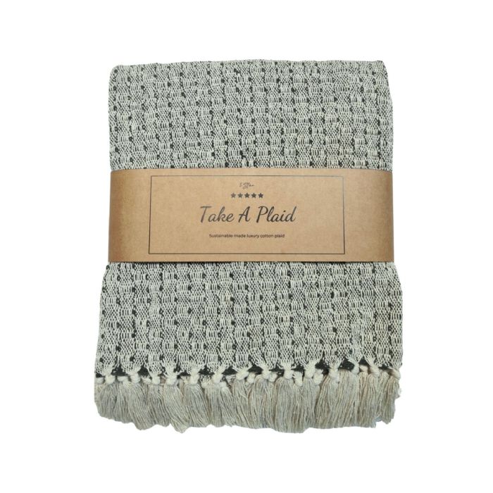Skab en hyggelig og stilfuld stemning i dit hjem med denne smukke bomulds plaid fra Take a plaid. Plaiden er fremstillet i 100% recycled bomuld, hvilket gør den både blød, komfortabel og til et mere bæredygtigt valg.