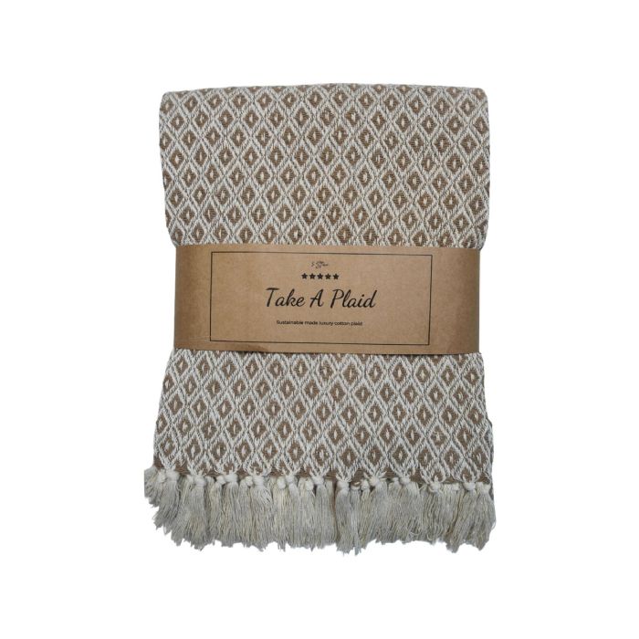 Skab en hyggelig og stilfuld stemning i dit hjem med denne smukke bomulds plaid fra Take a plaid. Plaiden er fremstillet i 100% recycled bomuld, hvilket gør den både blød, komfortabel og til et mere bæredygtigt valg.