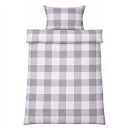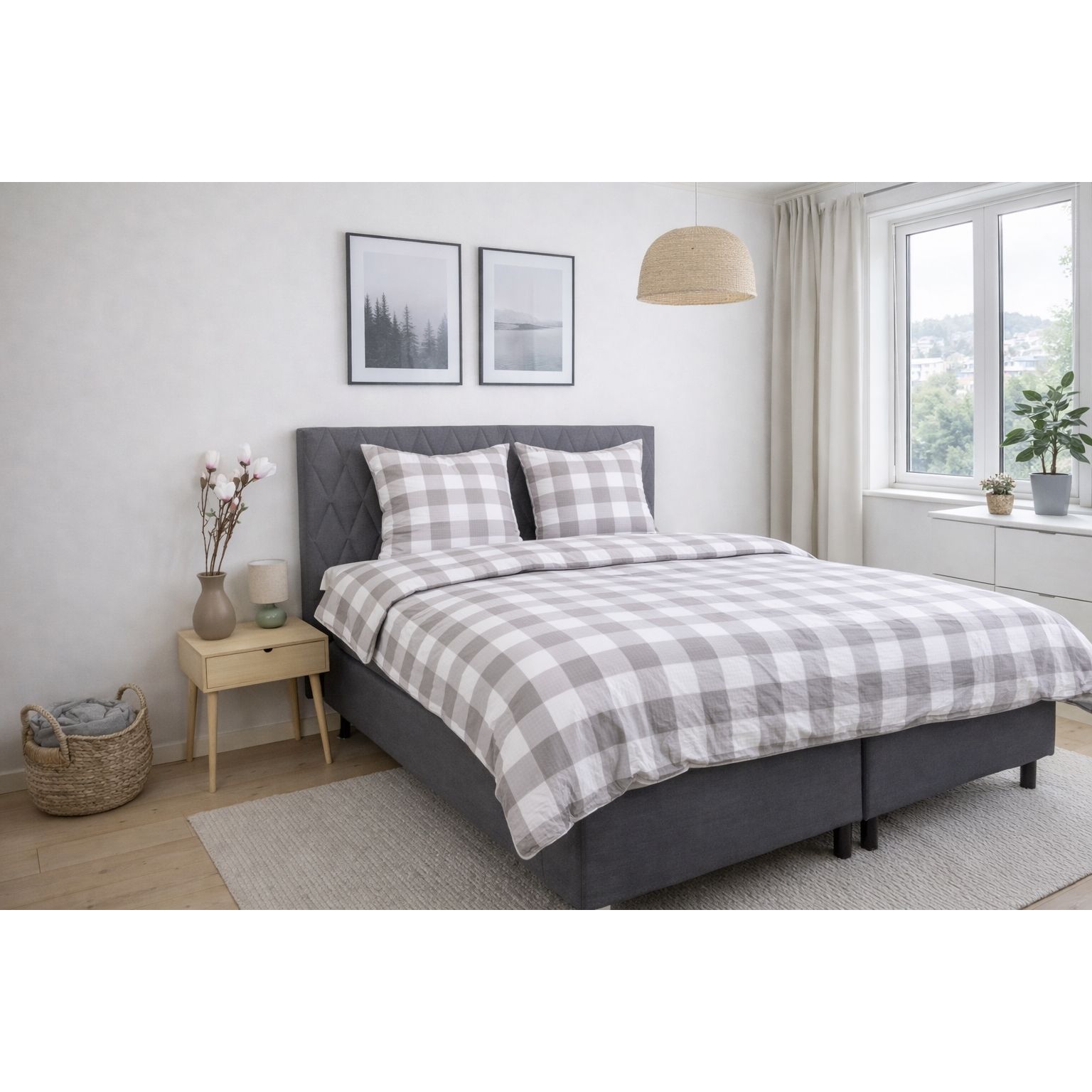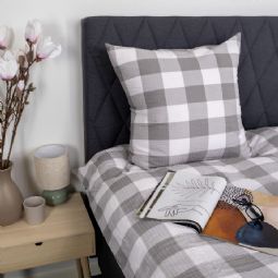 Dyne- og pudebetræk lukkes med lynlås, som gør det nemt at skifte sengetøj og holder både dyne og pude sikkert på plads natten igennem. Det ternede design i hvid og grå giver et roligt og tidløst udtryk, der passer godt ind i både moderne og klassiske soveværelser.