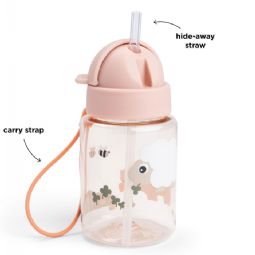Flasken er designet i en gennemsigtig lyserød farve med et sødt motiv - et design, der gør det sjovere for børn at huske at drikke vand i løbet af dagen. Med sin kompakte størrelse og lette vægt er drikkedunken nem at have med i tasken. Den er fremstillet i holdbare og fødevaregodkendte materialer og tåler opvaskemaskine, hvilket gør den ideel til en travl hverdag.