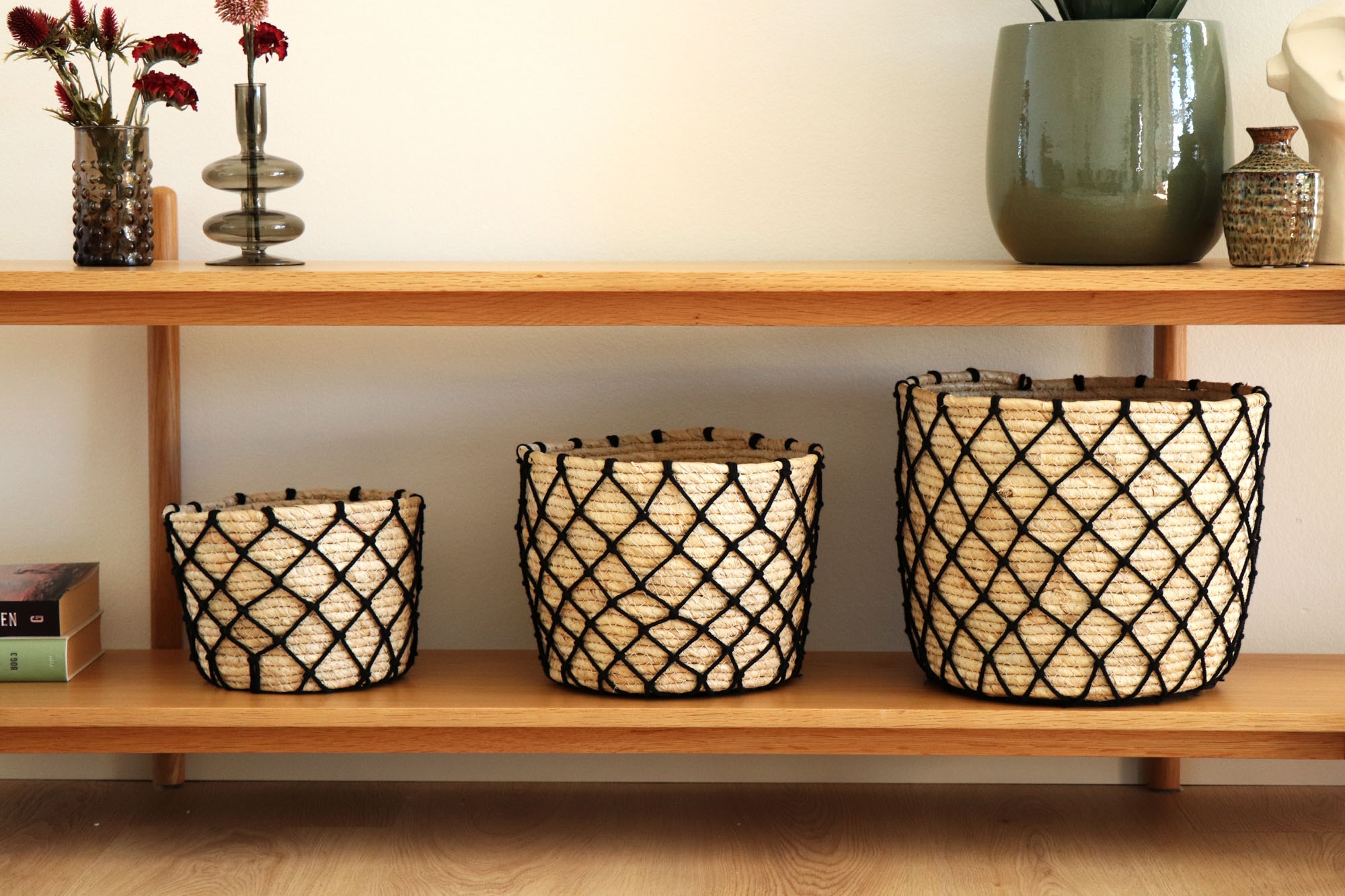 Fletkurve lavet af søgræs - Sæt med 3 stk. Dekorative fletkurve med sorte bomuldssnore. Søgræs er berømt for sin naturlige varme og holdbarhed, hvilket gør det til det ideelle materiale til vores fletkurve. Det er både miljøvenligt og robust, hvilket sikrer, at kurvene kan modstå daglig brug.
