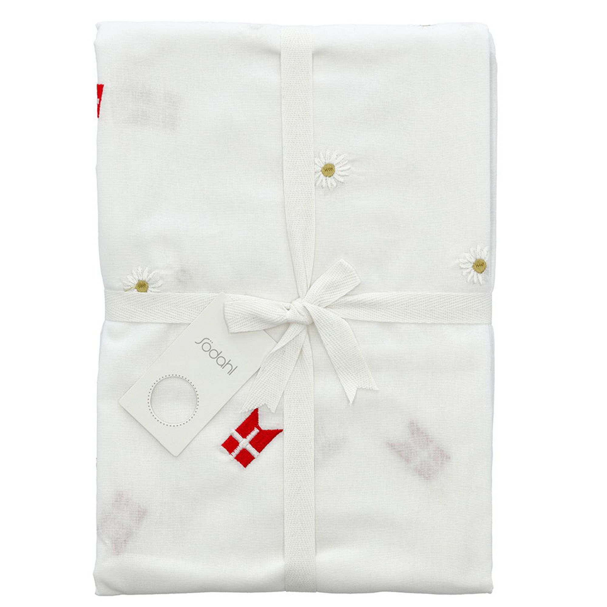 Skab en uforglemmelig og festlig borddækning med denne smukke Tillykke dug fra Södahl. Det elegante design med broderede danske flag og margueritter bringer glæde, tradition og hygge ind i dit hjem - perfekt til livets særlige øjeblikke.