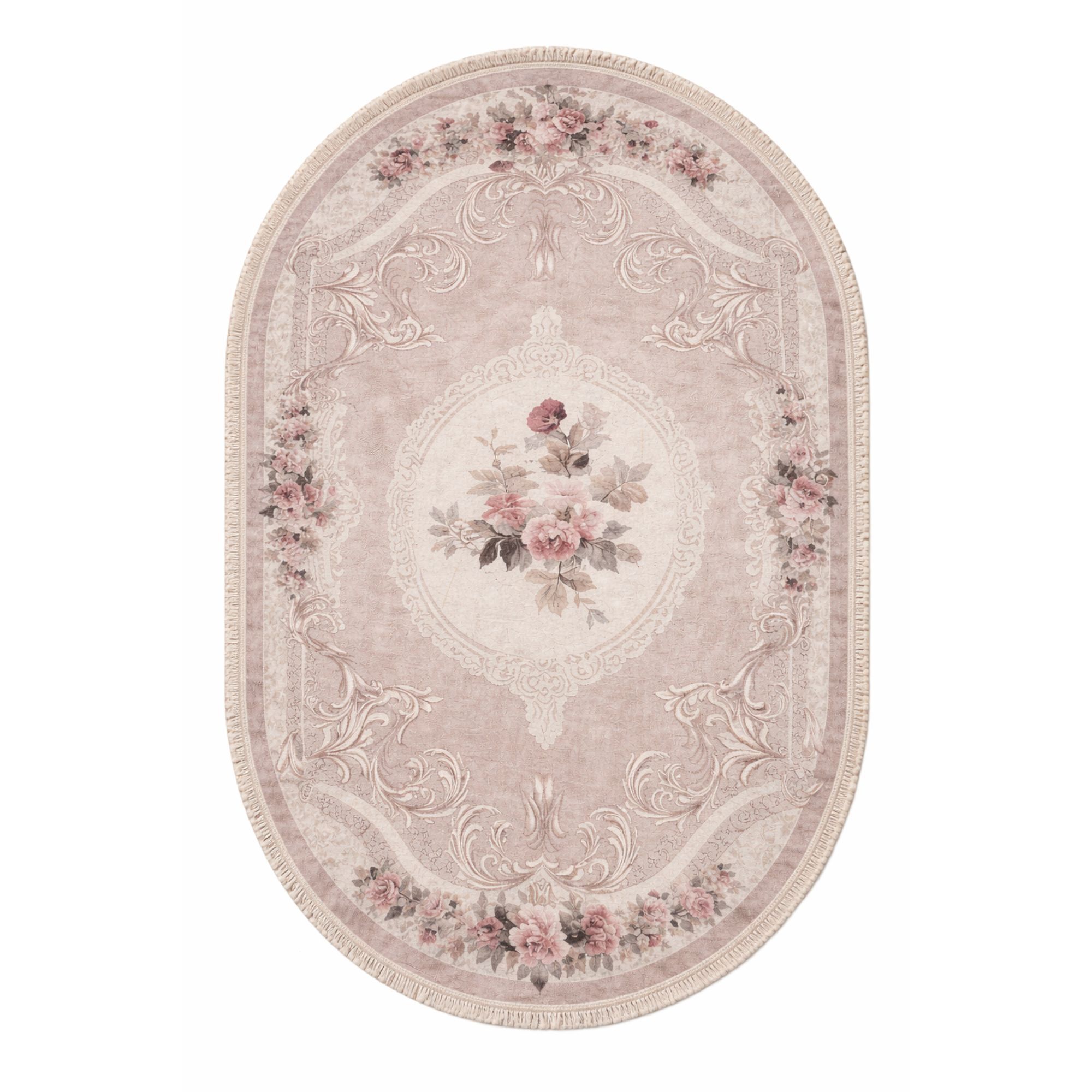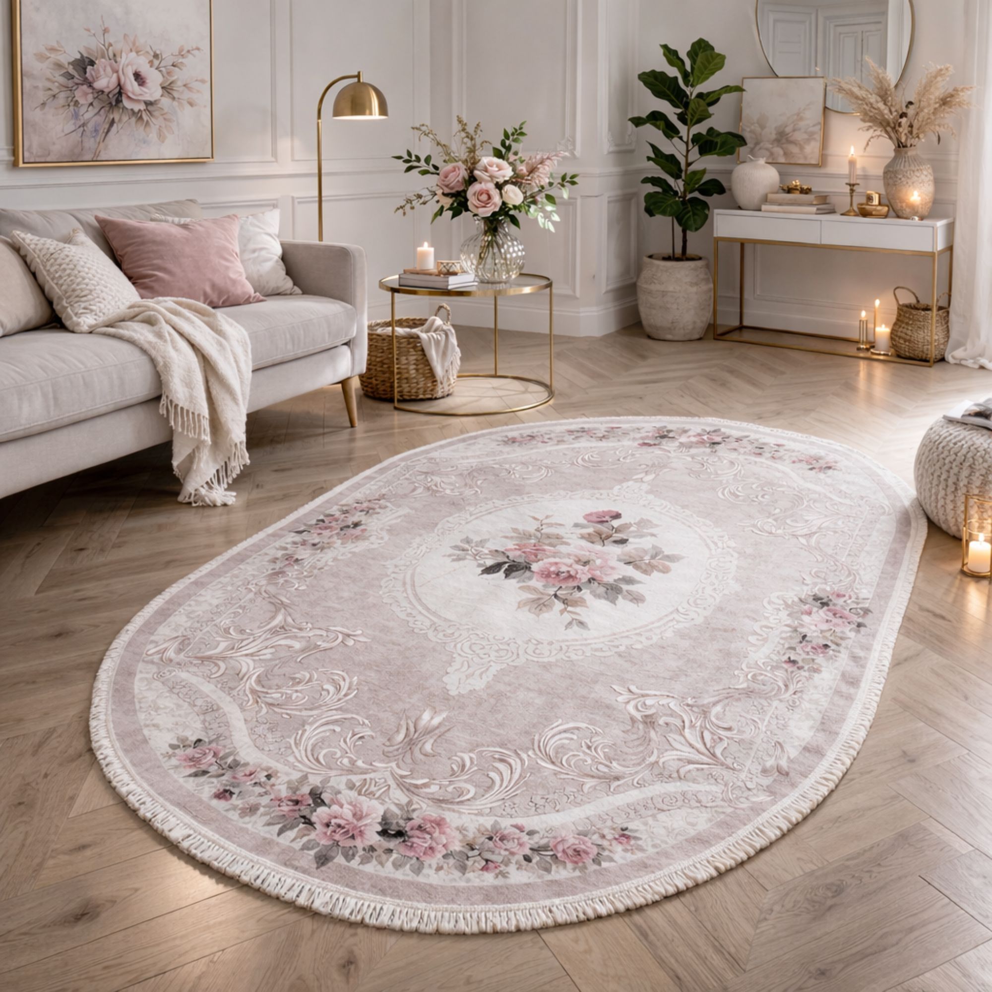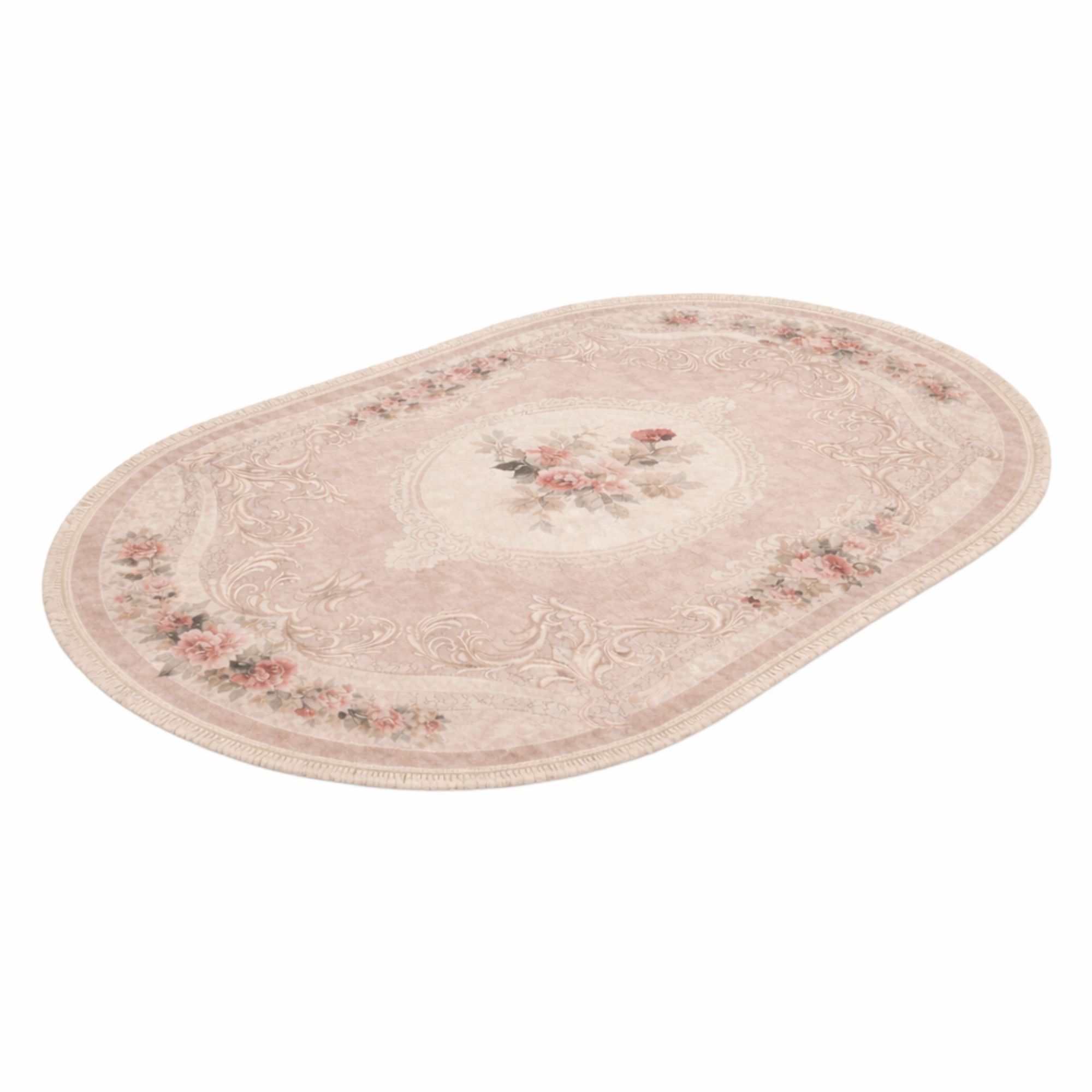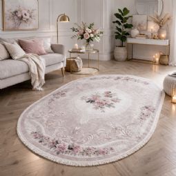 Dette ovale blomstrede gulvtæppe er et oplagt valg, hvis du ønsker et dekorativt tæppe, der både er praktisk, let at vedligeholde og elegant i sit udtryk. Kombinationen af romantisk design og funktionel kvalitet gør det til en stilfuld løsning i enhver bolig.