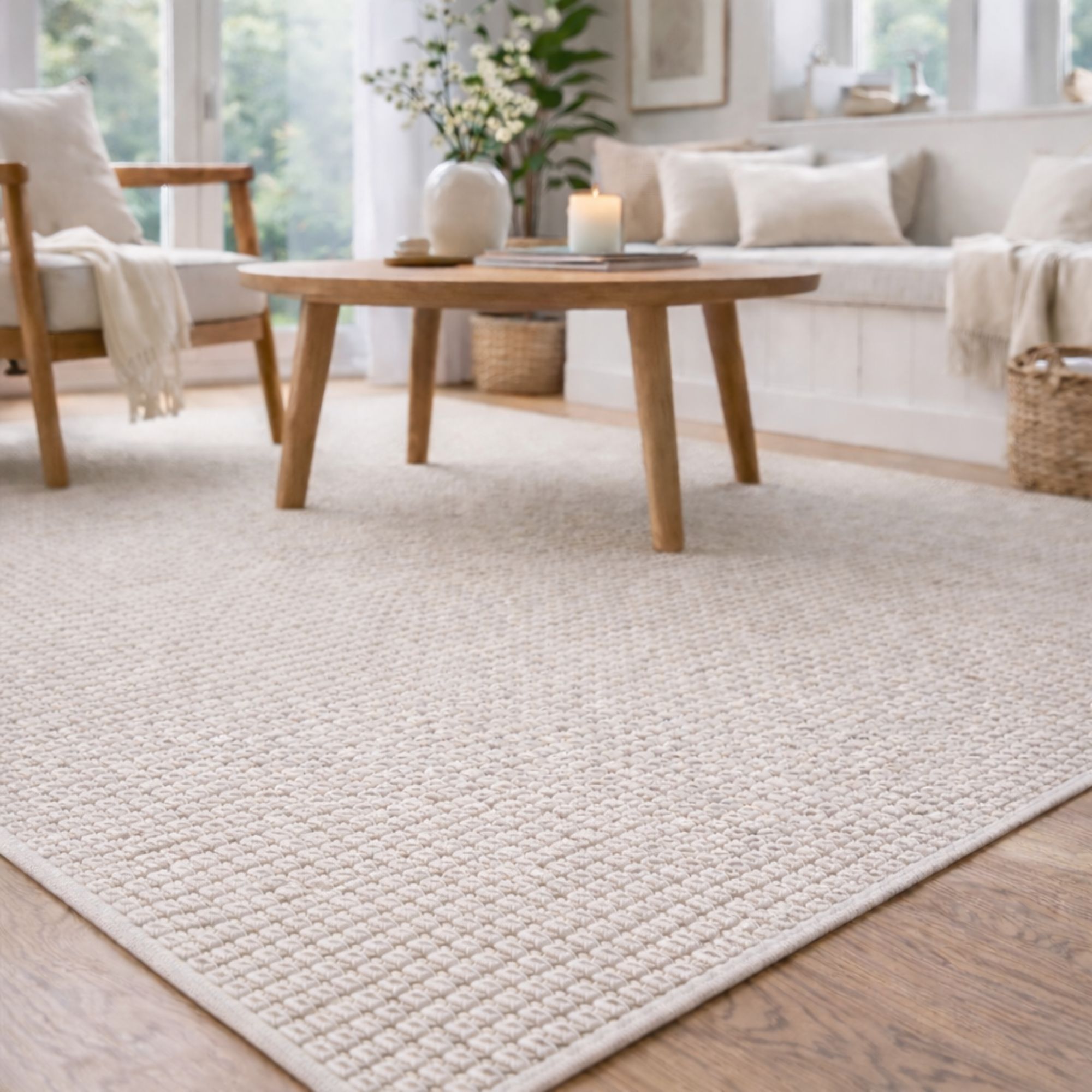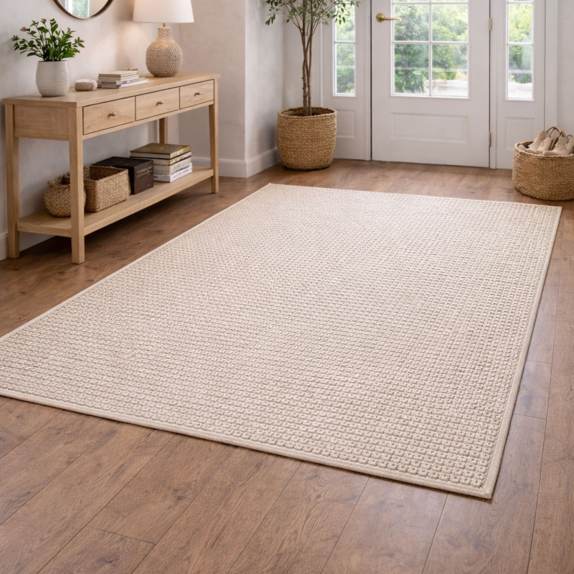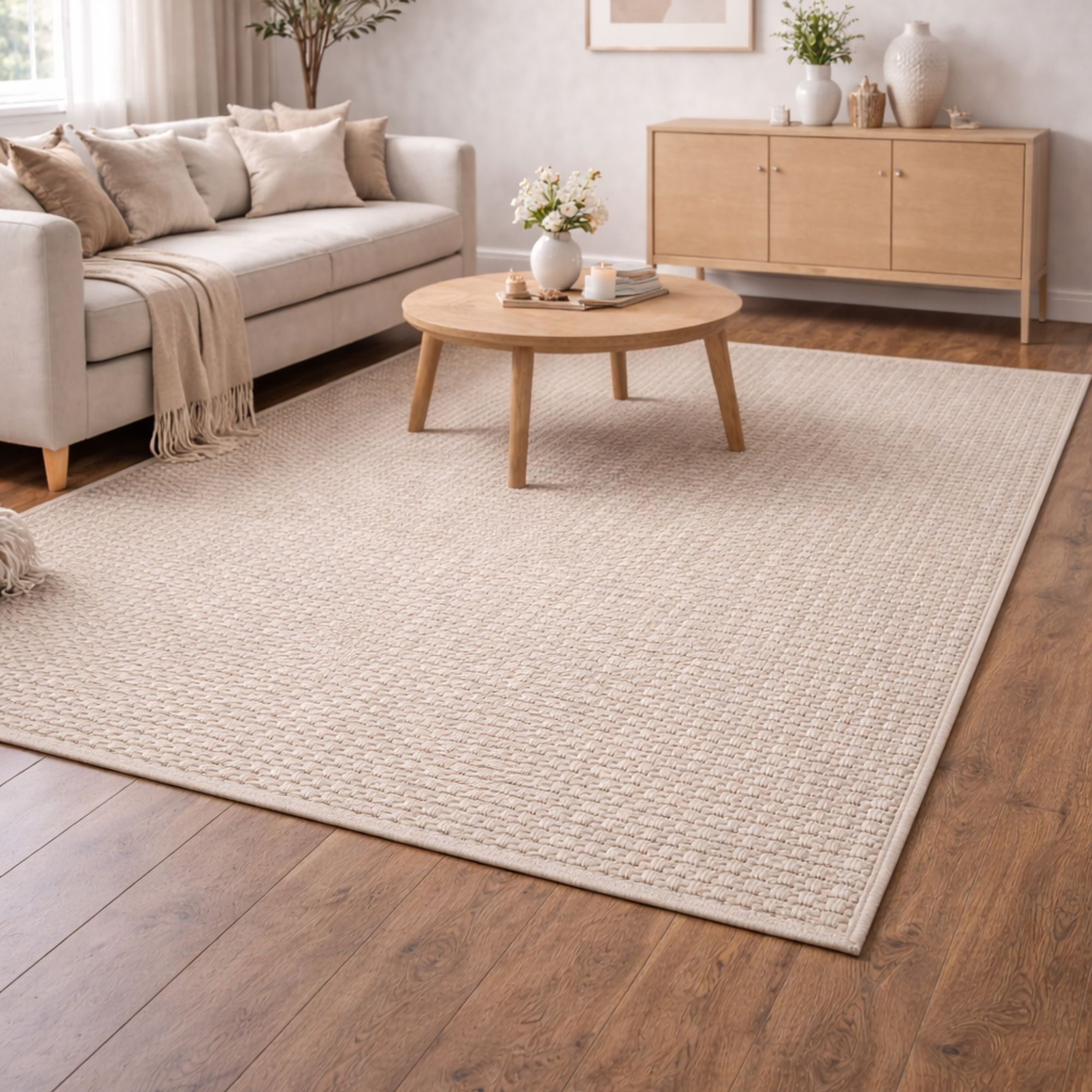 Elegant beige gulvtæppe som er det perfekte valg, hvis du ønsker et tidløst design, som skaber lidt ekstra stil i hjemmet. Den fine struktur og den lyse, naturlige farve giver rummet et mere harmonisk udtryk, som passer ind i i et hvilket som helst hjem. Tæppet er ideelt i stuen under sofabordet, i soveværelset eller som et blødt og indbydende element i entréen.