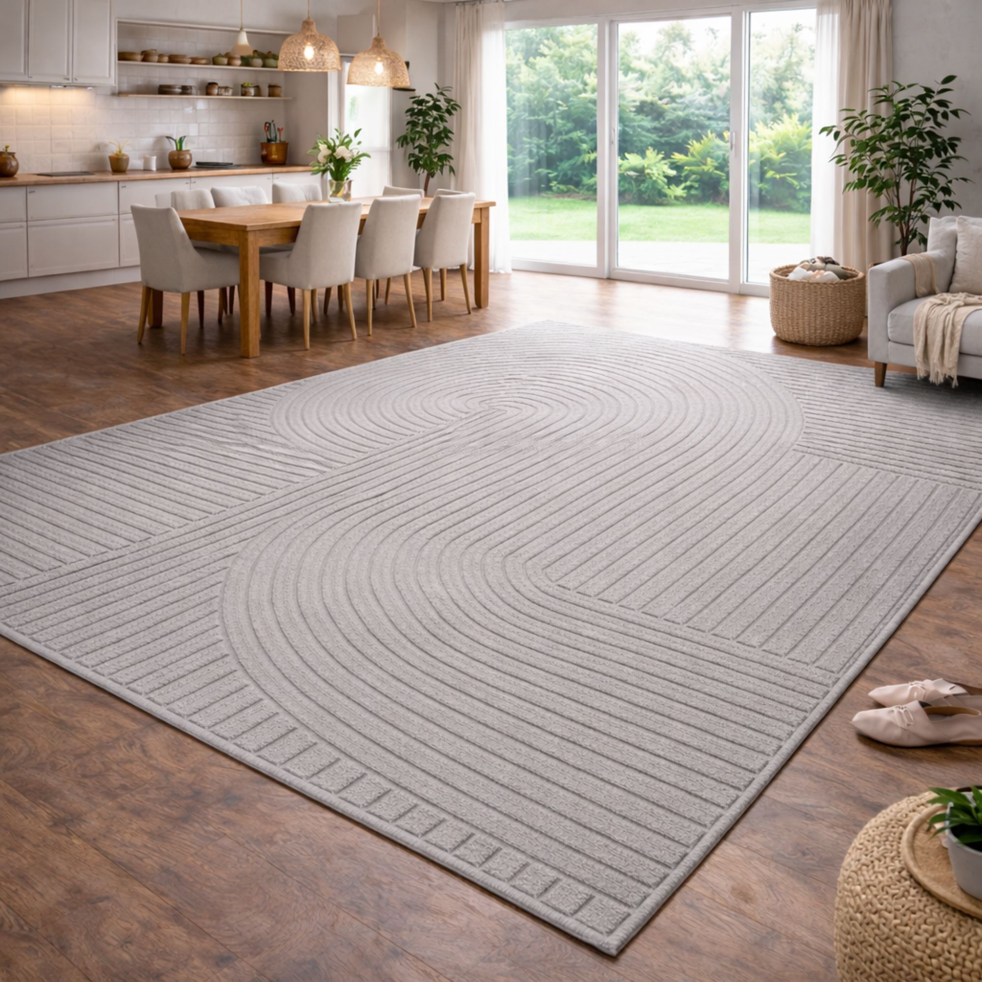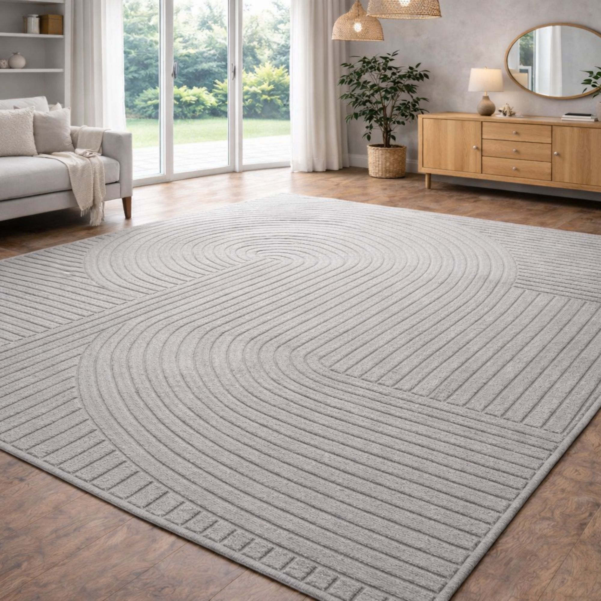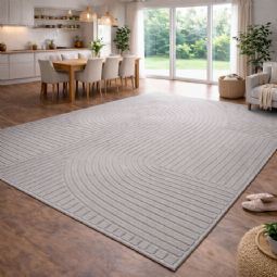 Dette flotte, store moderne gulvtæppe kan nemt løfte hele rummets udtryk - og kan det bl.a. fordi det kombinerer komfort, slidstyrke og et stilfuldt grafisk design i én løsning. Det grå tone-i-tone mønster med bløde, organiske buer pifter hjemmet op, og passer perfekt ind i både nordisk og minimalistisk indretning. Den grå nuance giver rummet et lyst og indbydende udtryk og fungerer flot sammen med alt fra lyse træsorter og beige toner til mere kontrastfyldte omgivelser.