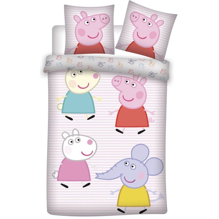 Sengetøjet er i et vendbart design. På forsiden ses Gurli Gris, Karina Kanin, Frida Får og Emilie Elefant, og bagsiden er der all-over print af dem alle. Sengesættet er produceret i 100% bomuld som gør sættet slidestærkt, blødt og giver høj absorbering samt åndbarhed. Den rene bomuldskvalitet giver et lækkert og blødt sengesæt, som ovenikøbet er let at vedligeholde og skaber et dejligt sovemiljø for dit barn.