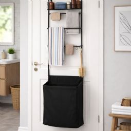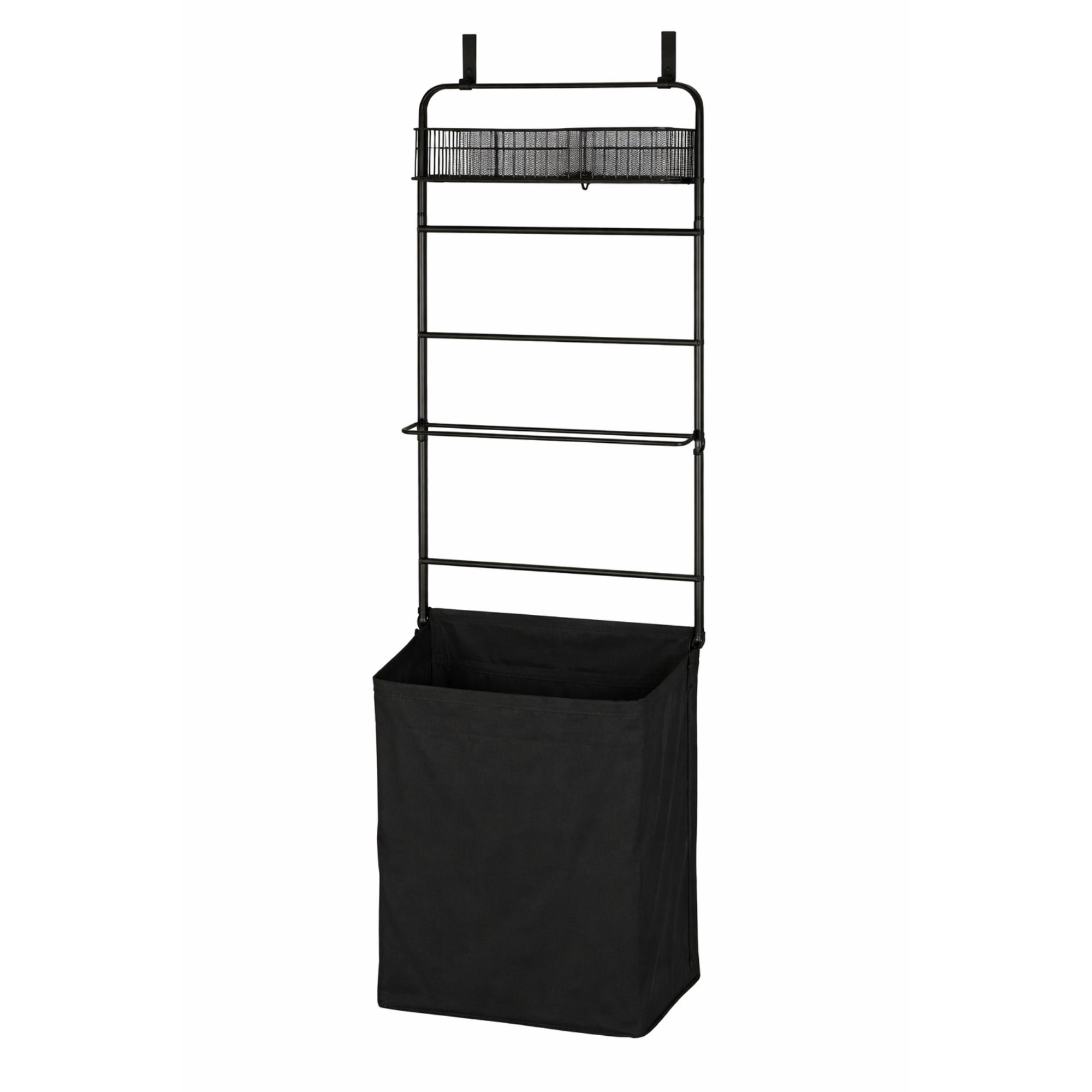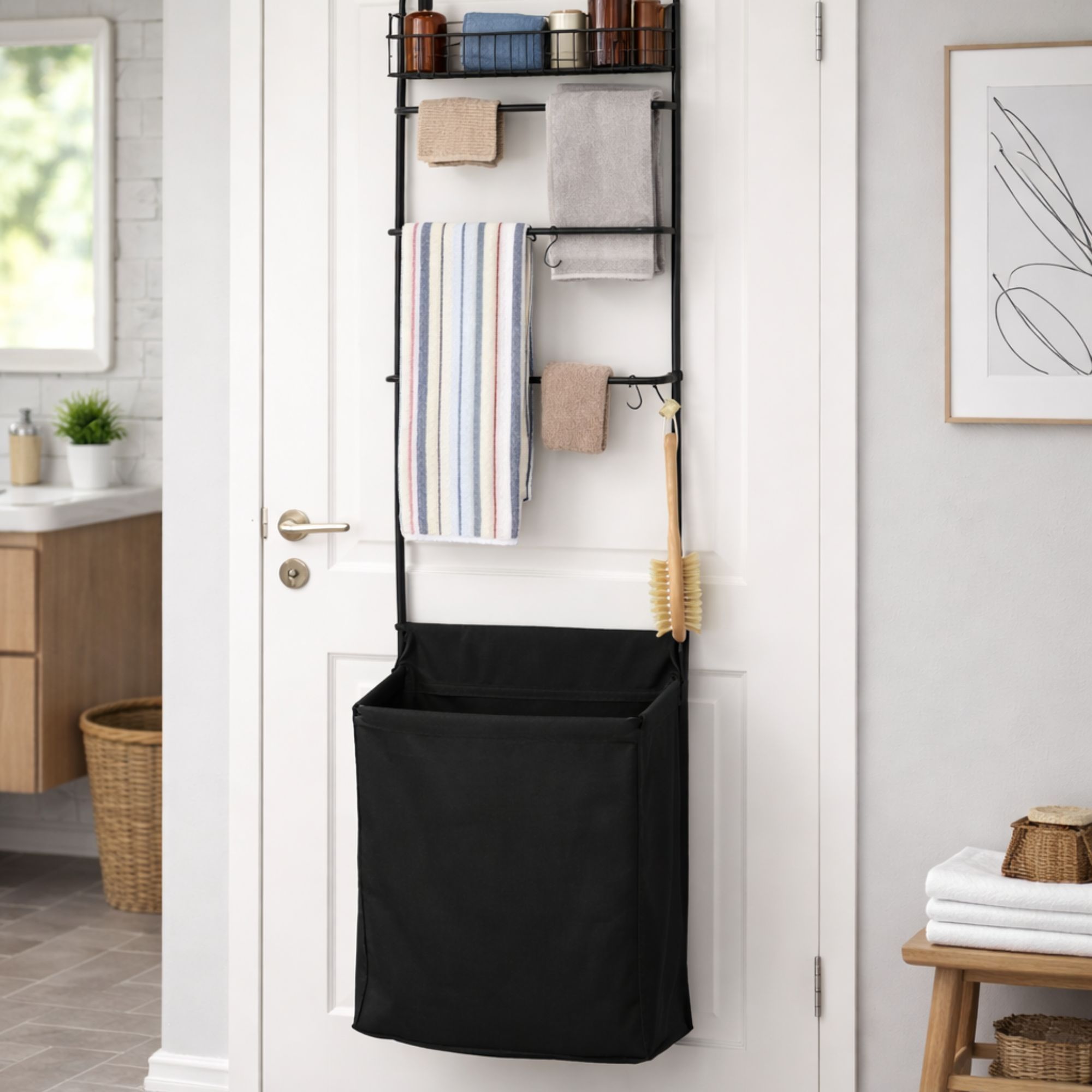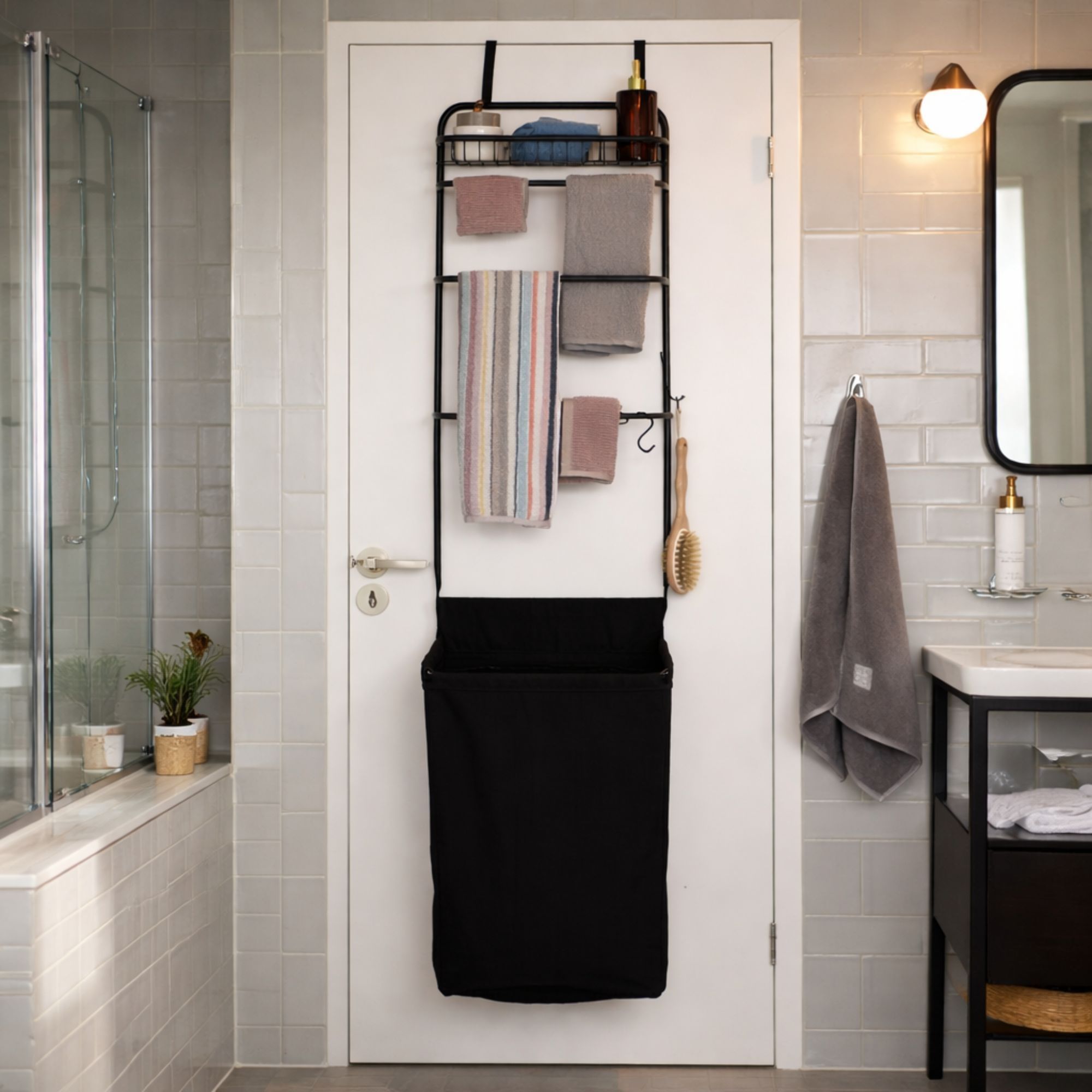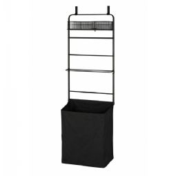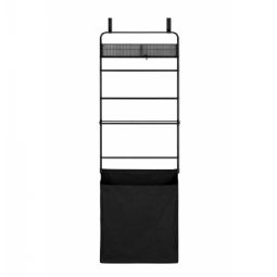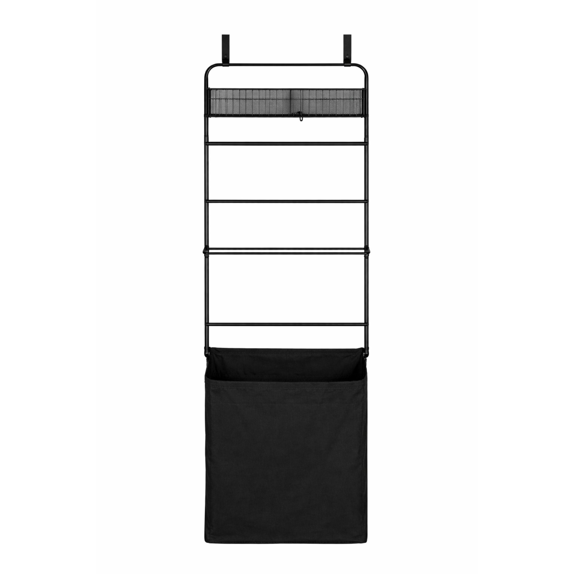 Den smarte opbevaring med ophæng til dør er sammensat af en tråd kurv, tre tørrerækker, to aftagelige kroge til at bruge på tørrerækkerne og en stof kurv i bunden. Den er er ensfarvet sort og produceret af stål som er pulverlakeret, samt kurven er lavet af kraftigt lærredsstof og kan nemt hæftes af stativet. Denne kombination hele ophænget, mere modstandsdygtige over for ridser, skammer, samt meget nem at rengøre.