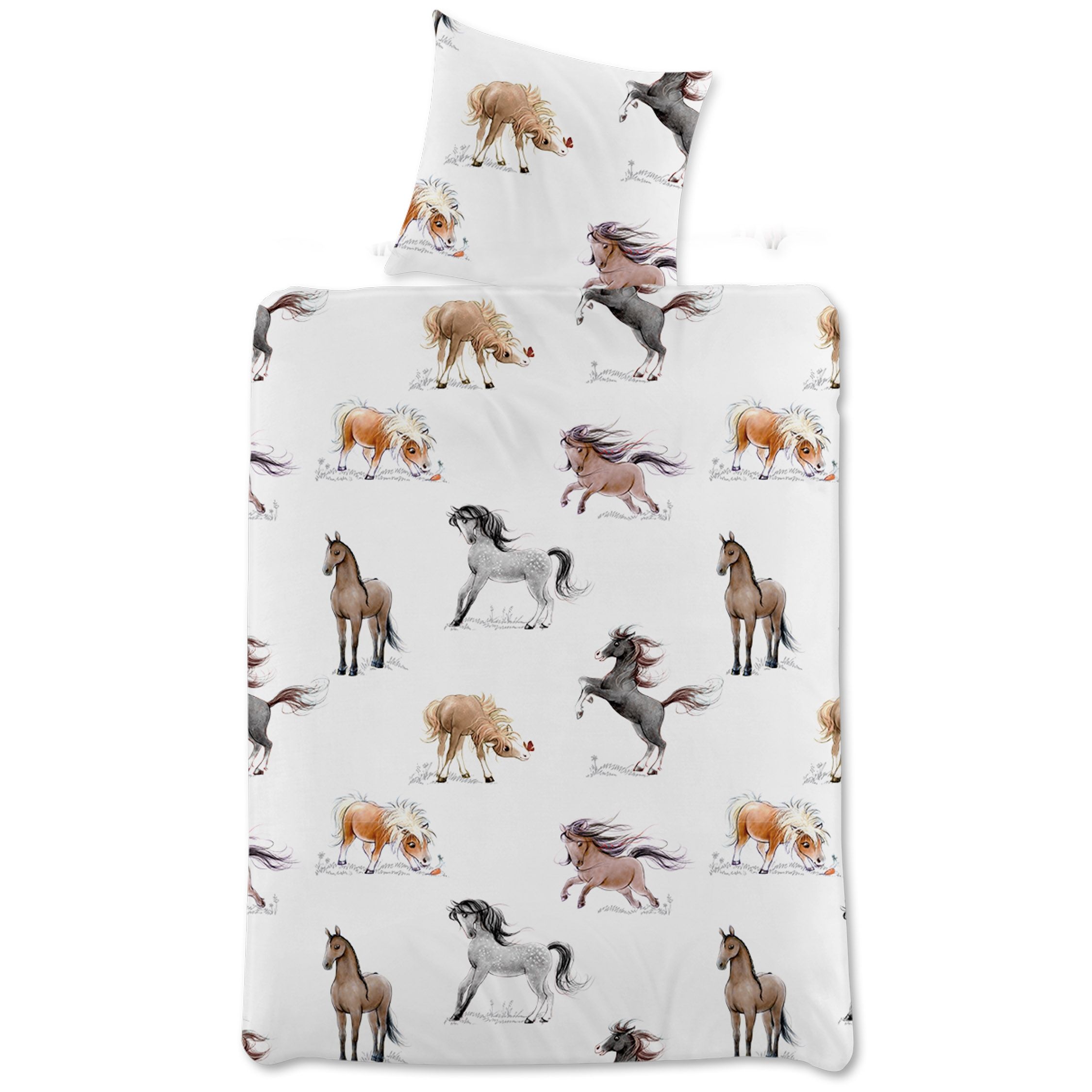 Junior sengetøj med forskellige heste. Produceret i 100% bomuldssatin vævet af fine, åndbare tråde, som giver sengesættet en ekstra glat og luksuriøs overflade. Kombinationen af bomuldens naturlige egenskaber og den elegante satinfinish, sammen med et flotte design, gør dette sengesæt til en sikker favorit.