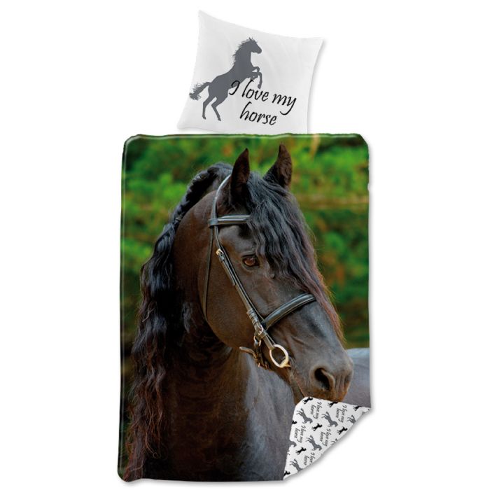 Et flot heste sengetøj, der er vendbart med forskellige motiver for og bag. På den ene side er der motiver af en flot sort/brun hest. Vender du sengesættet om, ses en side med aftryk af små heste. Enhver hesteglad glad pige eller dreng, vil elske dette sæt sengetøj. Det er altid en god ide at gøre brug af barnets interesser, hvis man ønsker at skabe et tryggere og mere spændende sovemiljø til sit barn.