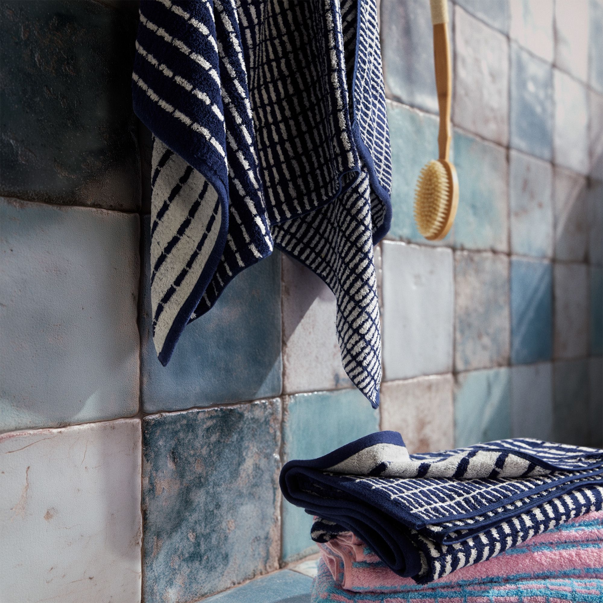 Den fine vævning kombineret med det elegante mønster i blå/hvid skaber et stilrent og roligt udtryk, der passer ind i ethvert moderne badeværelse. Håndklædet er ikke kun flot at se på og har en høj absorberingsevne og hurtig tørring, så du altid har et friskt håndklæde ved hånden.