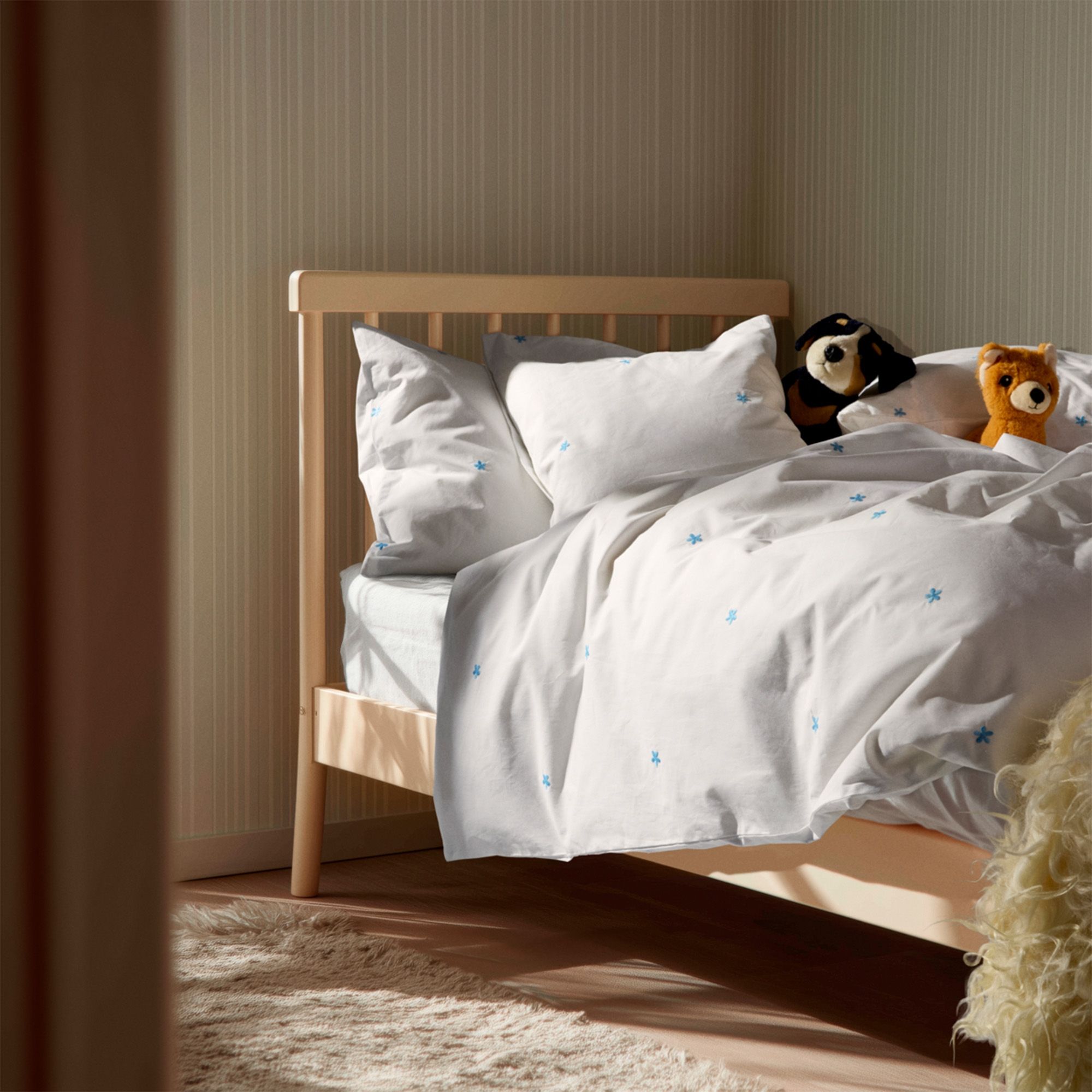 Den fine percalevævning giver en let og behagelig tekstur, samtidig med at materialet er slidstærkt og holder sig flot vask efter vask. De små broderede blomster skaber et hyggeligt og legende udtryk, der passer perfekt ind i både moderne og klassiske børneværelser.