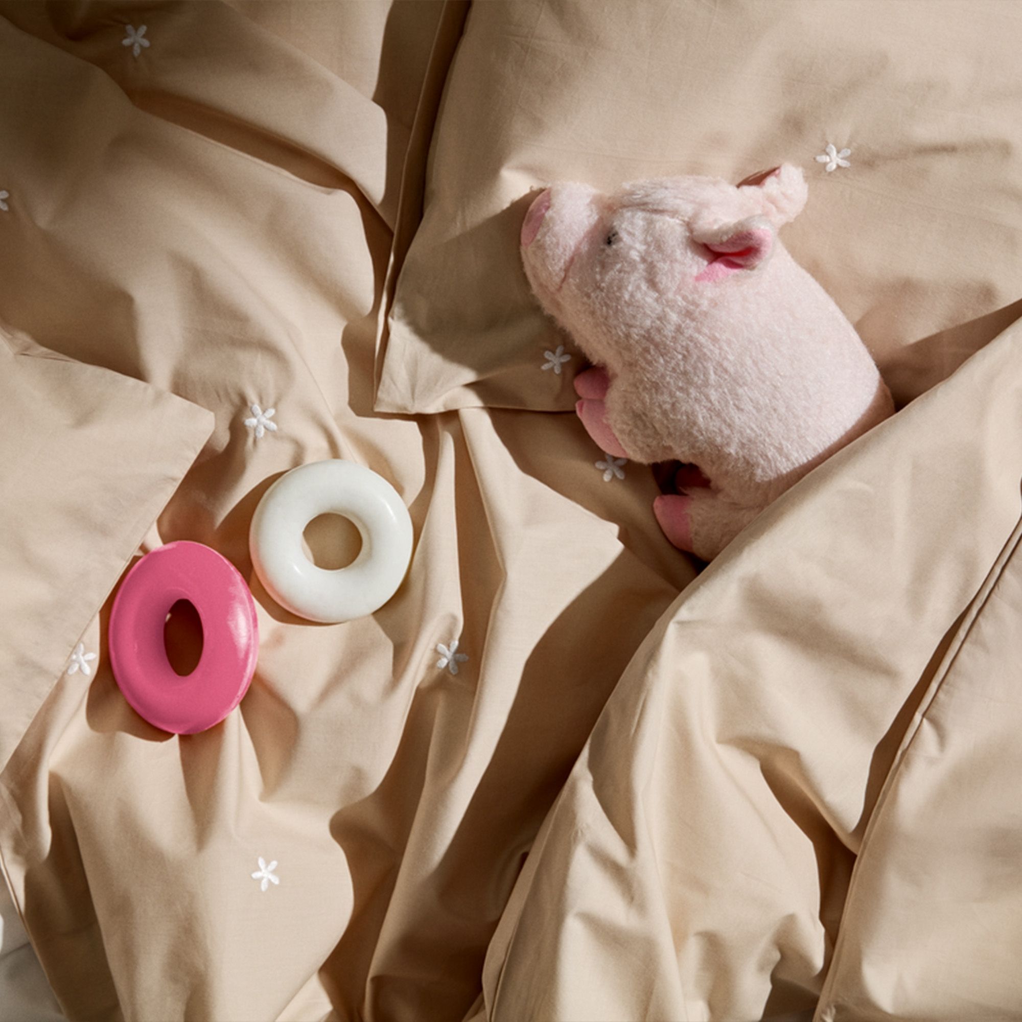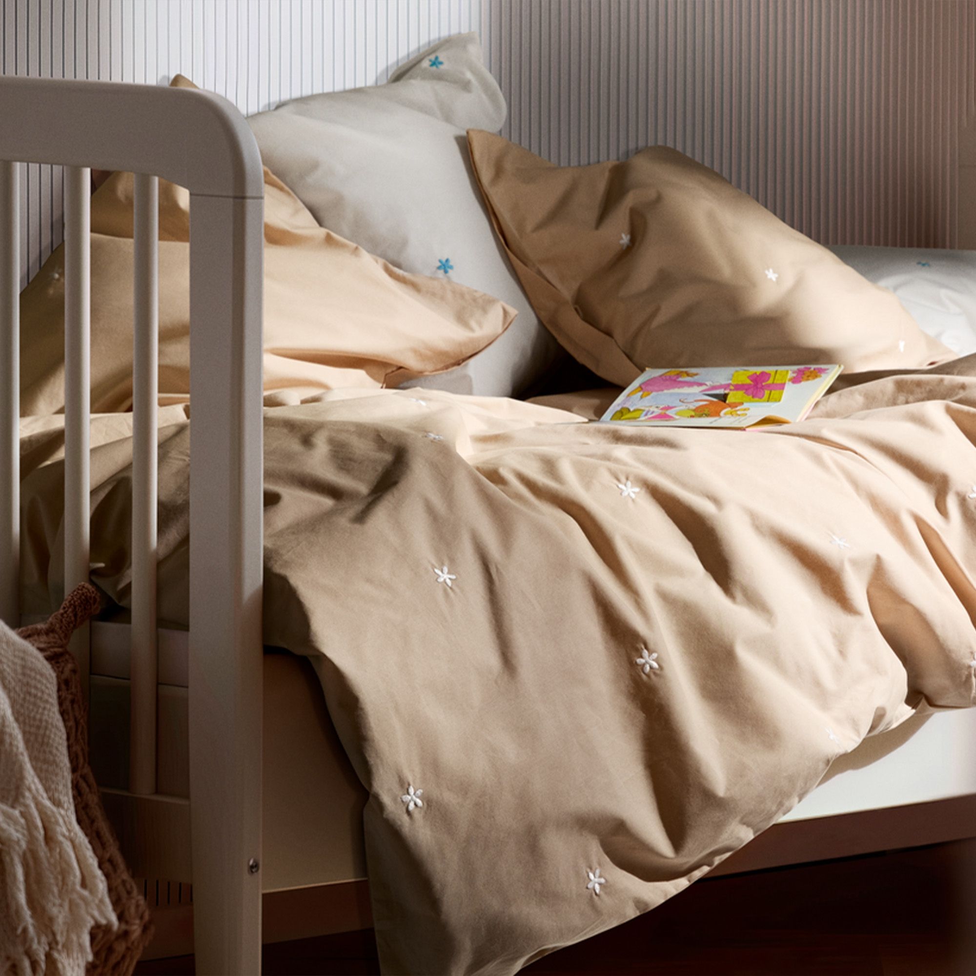 Den fine percalevævning giver en let og behagelig tekstur, samtidig med at materialet er slidstærkt og holder sig flot vask efter vask. De små broderede blomster skaber et hyggeligt og legende udtryk, der passer perfekt ind i både moderne og klassiske børneværelser.