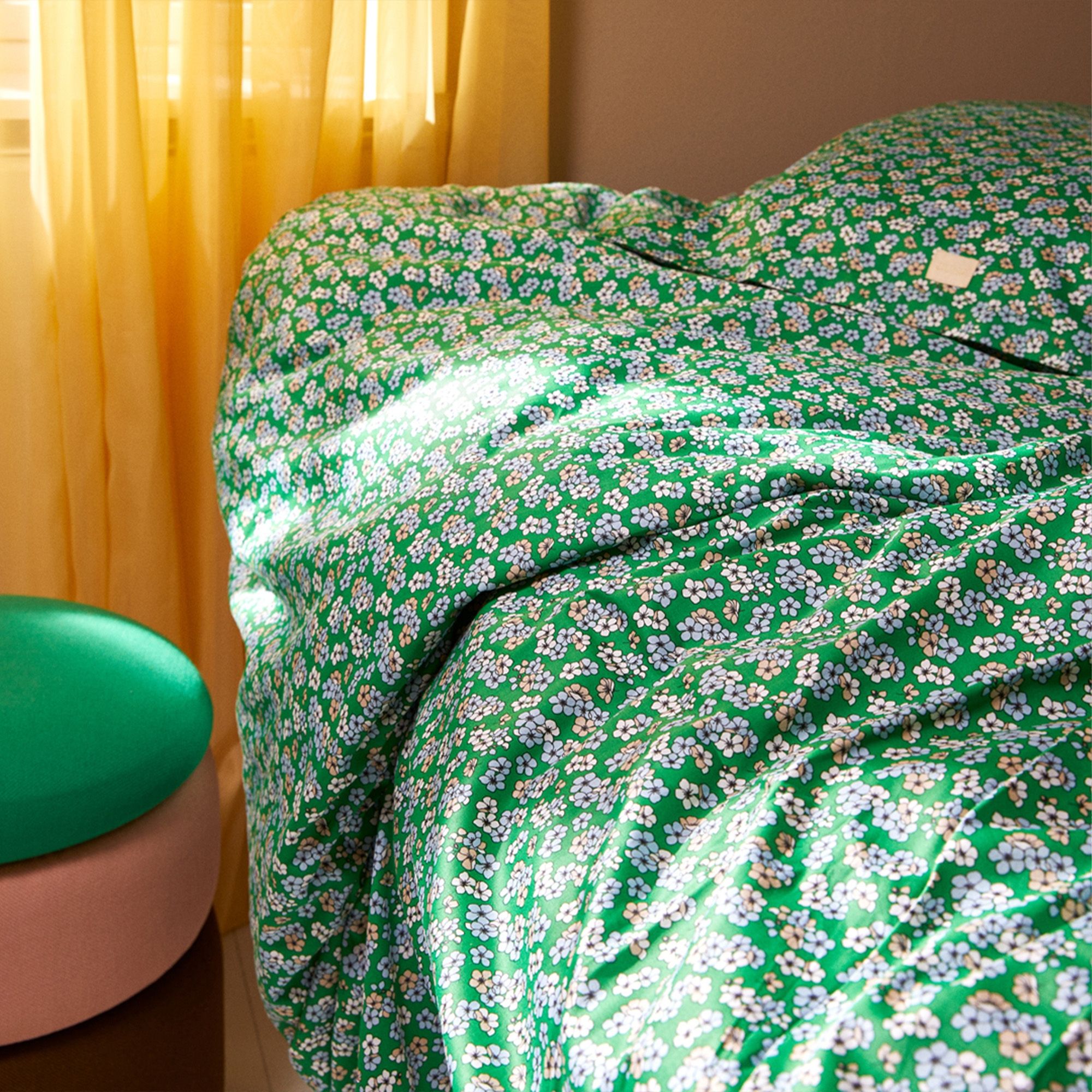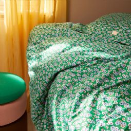 Bomuldssatin er kendt for sin ekstra bløde og glatte struktur, som giver en luksuriøs følelse og gør det endnu mere indbydende at krybe under dynen. Det blomstrede design i grønne nuancer skaber en naturlig og afslappende atmosfære i soveværelset.