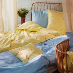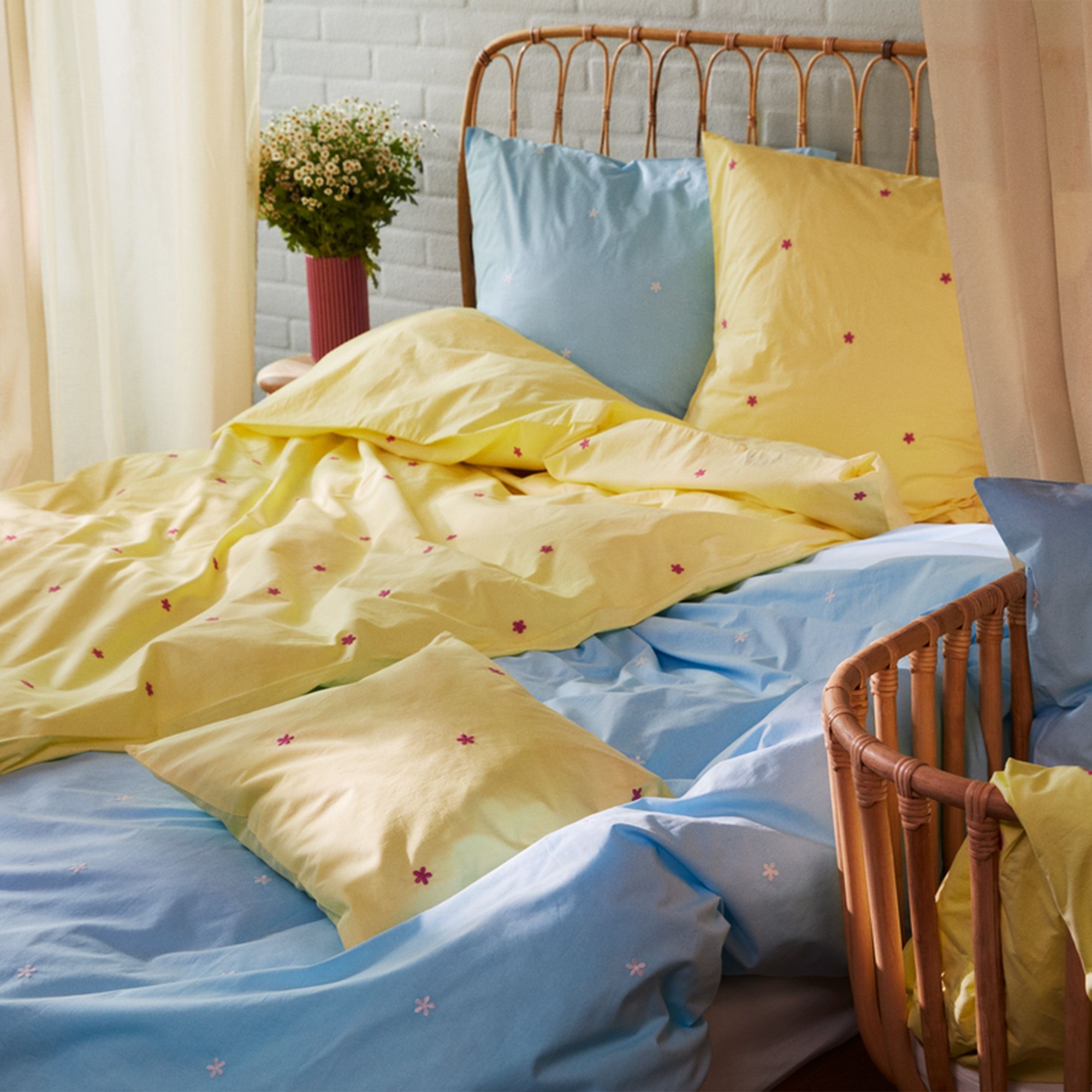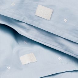 Daisy sengetøj med ekstra længde i økologisk bomuld - lyseblå med broderede blomster
