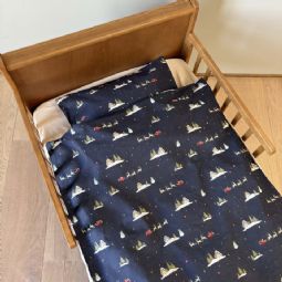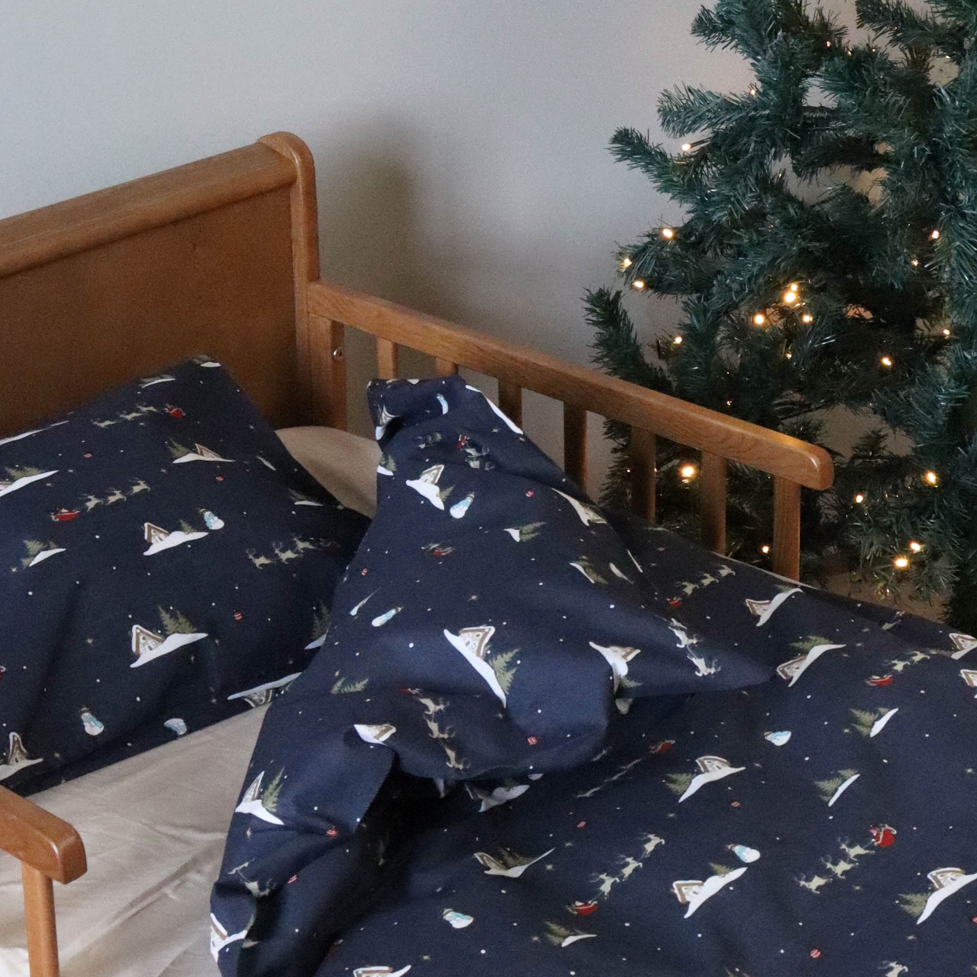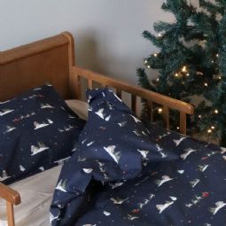Blødt julesengetøj i 100% bomuld, med julemanden og rensdyr. Produceret med lette og åndbare bomuldstråde som giver sengesættet en følelse af blødhed, der gør at dynen føles dejlig for dit barn at sove med. Balancen i naturlig egenskaber og komfort fra det bløde materiale, kombineret med det hyggelige juledesign, gør dette sæt til en sikker favorit hos dit barn.