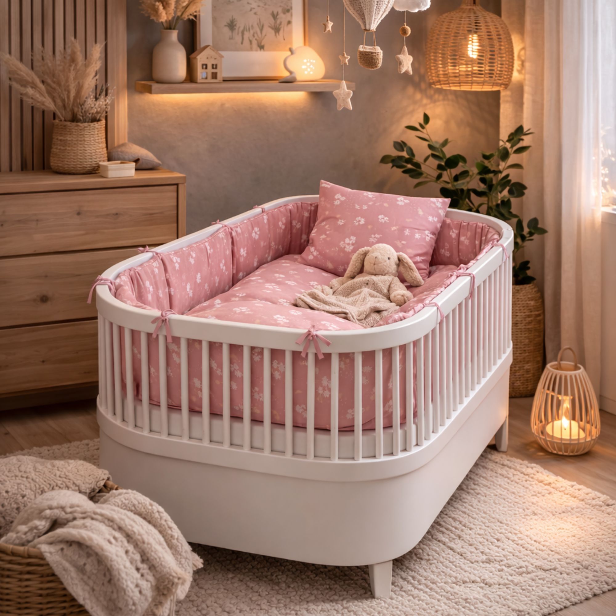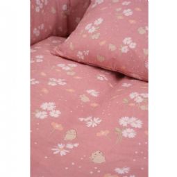 Dette fine baby sengesæt har et sødt og roligt design med små kaniner, gulerødder og diskrete blomsterdetaljer. Den lyserøde baggrund giver sengesættet et naturligt og harmonisk udtryk, som passer perfekt til et hyggeligt børneværelse.