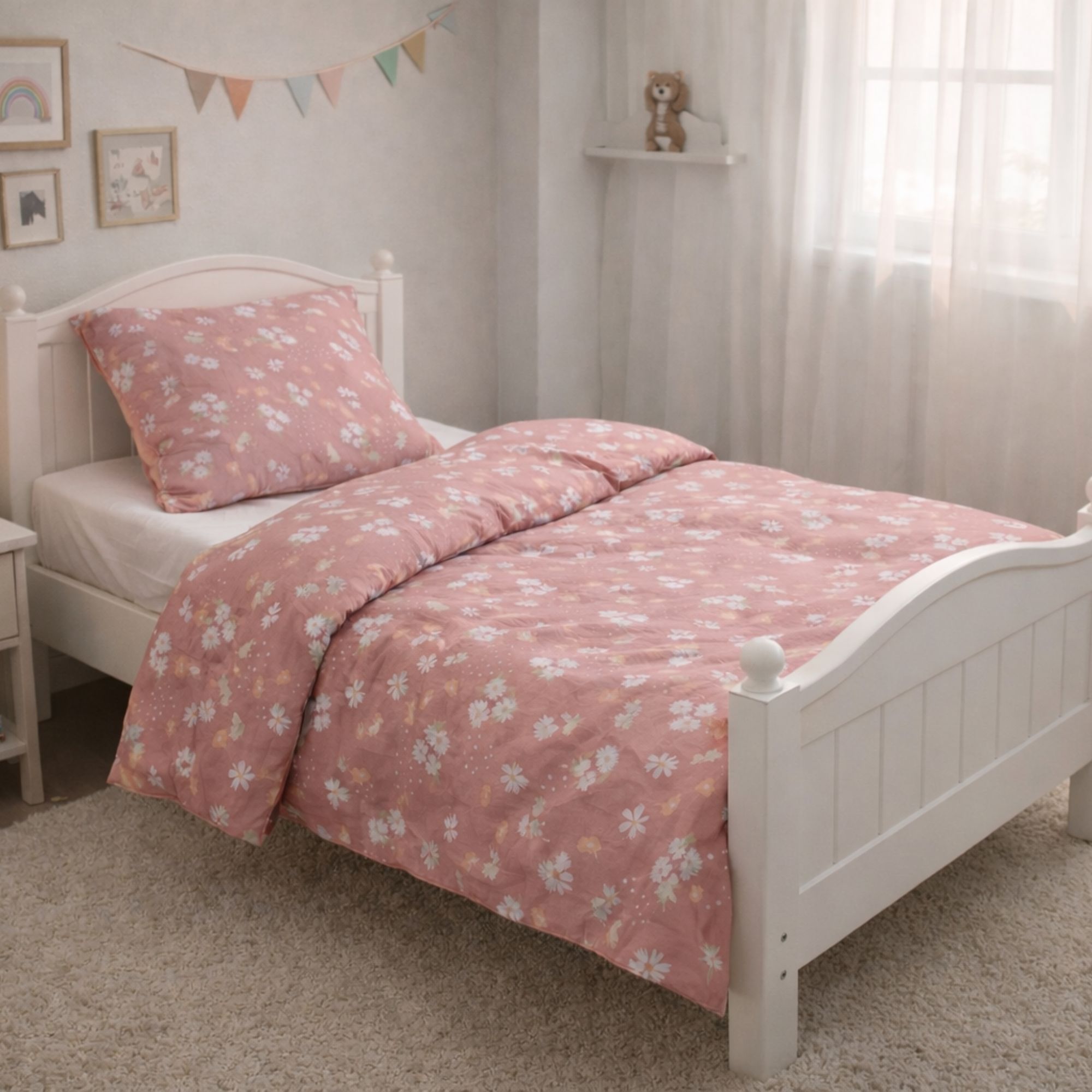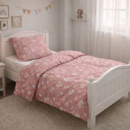 Dette fine junior sengesæt har et sødt og roligt design med små kaniner, gulerødder og diskrete blomsterdetaljer. Den lyserøde baggrund giver sengesættet et naturligt og harmonisk udtryk, som passer perfekt til et hyggeligt børneværelse.