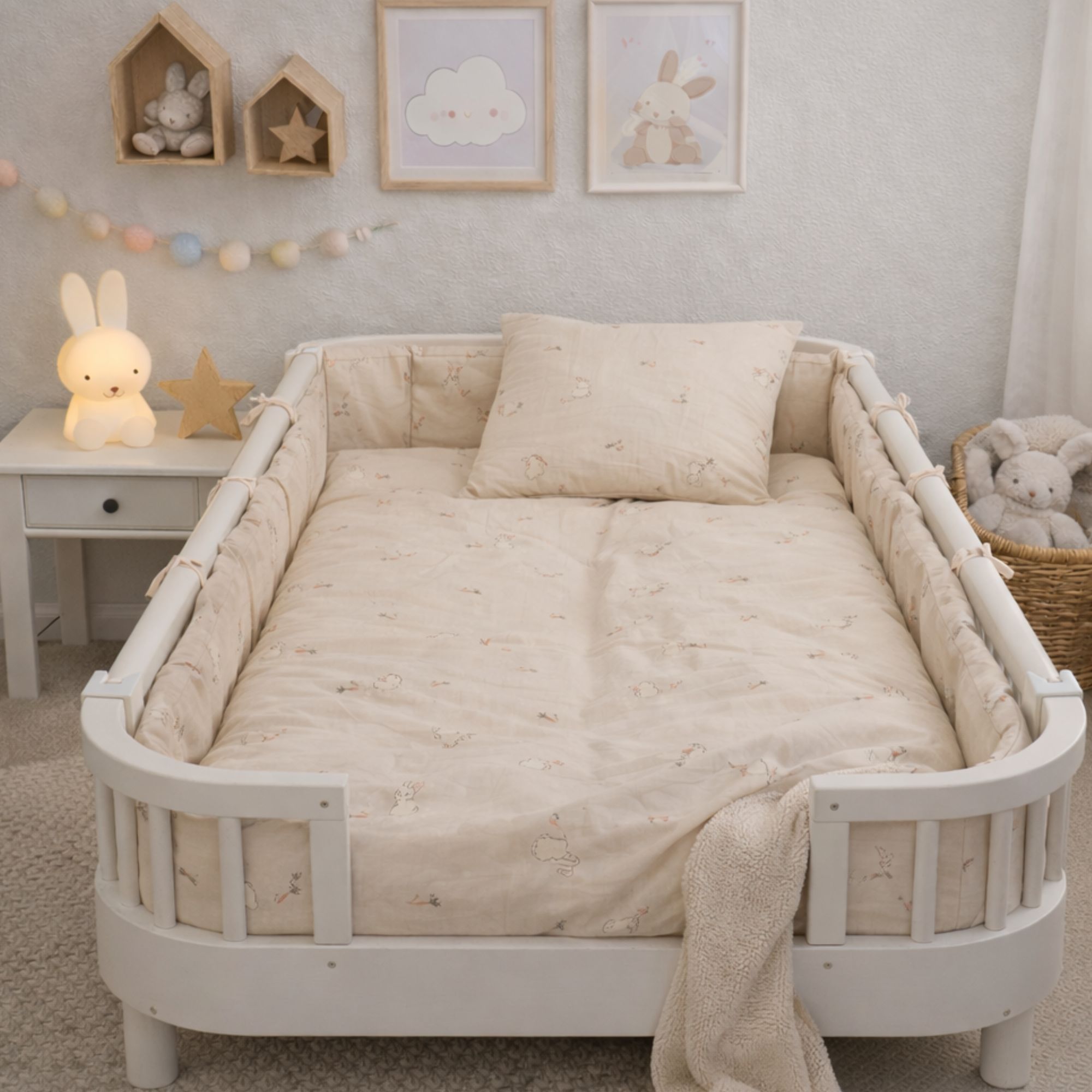 Dette fine junior sengesæt har et sødt og roligt design med små kaniner, gulerødder og diskrete blomsterdetaljer. Den bløde beige baggrund giver sengesættet et naturligt og harmonisk udtryk, som passer perfekt til et hyggeligt børneværelse.