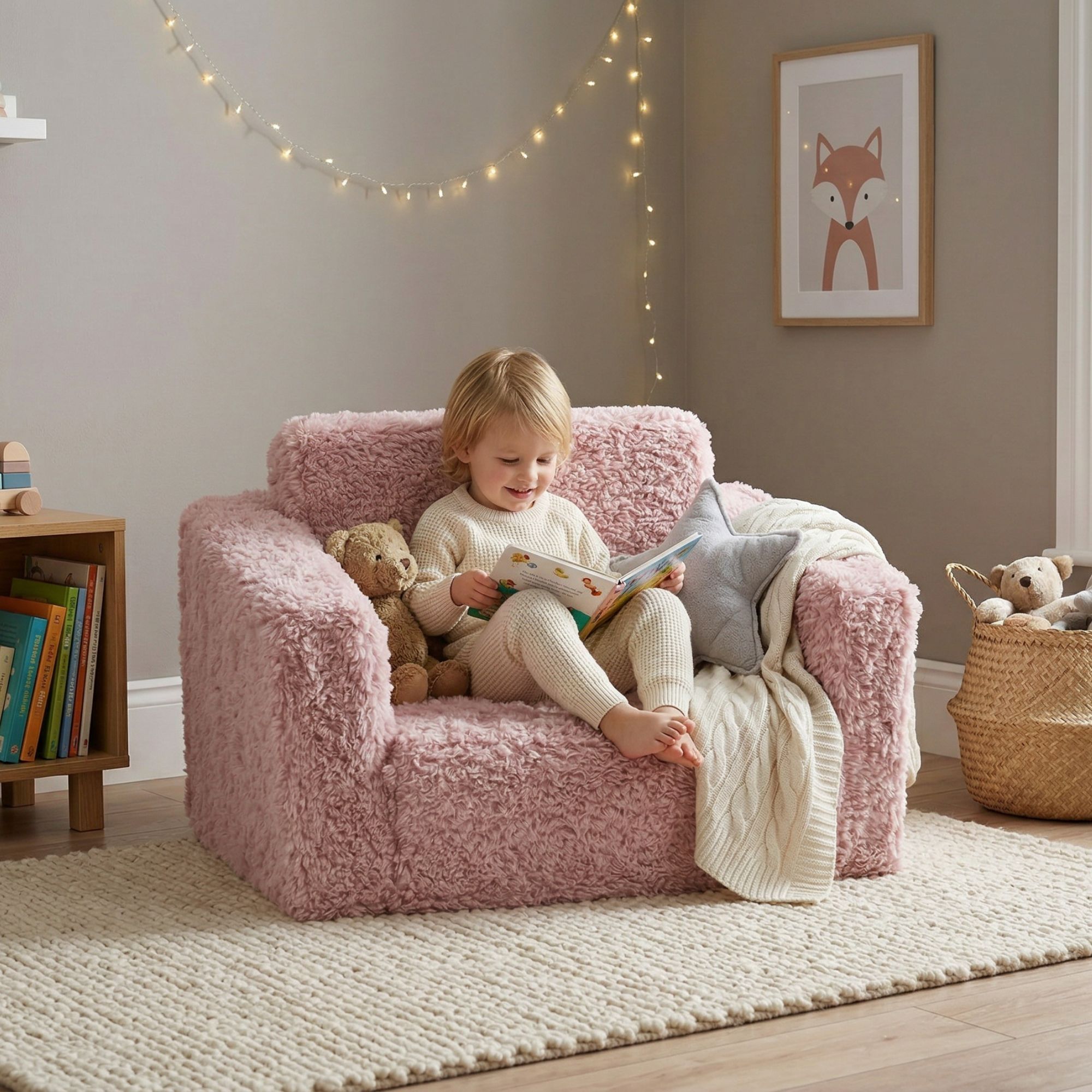 Det neutrale lyserøde plys design giver stolen et nordisk og tidløst udtryk, der passer naturligt ind i moderne indretning - både på børneværelset og i stuen.