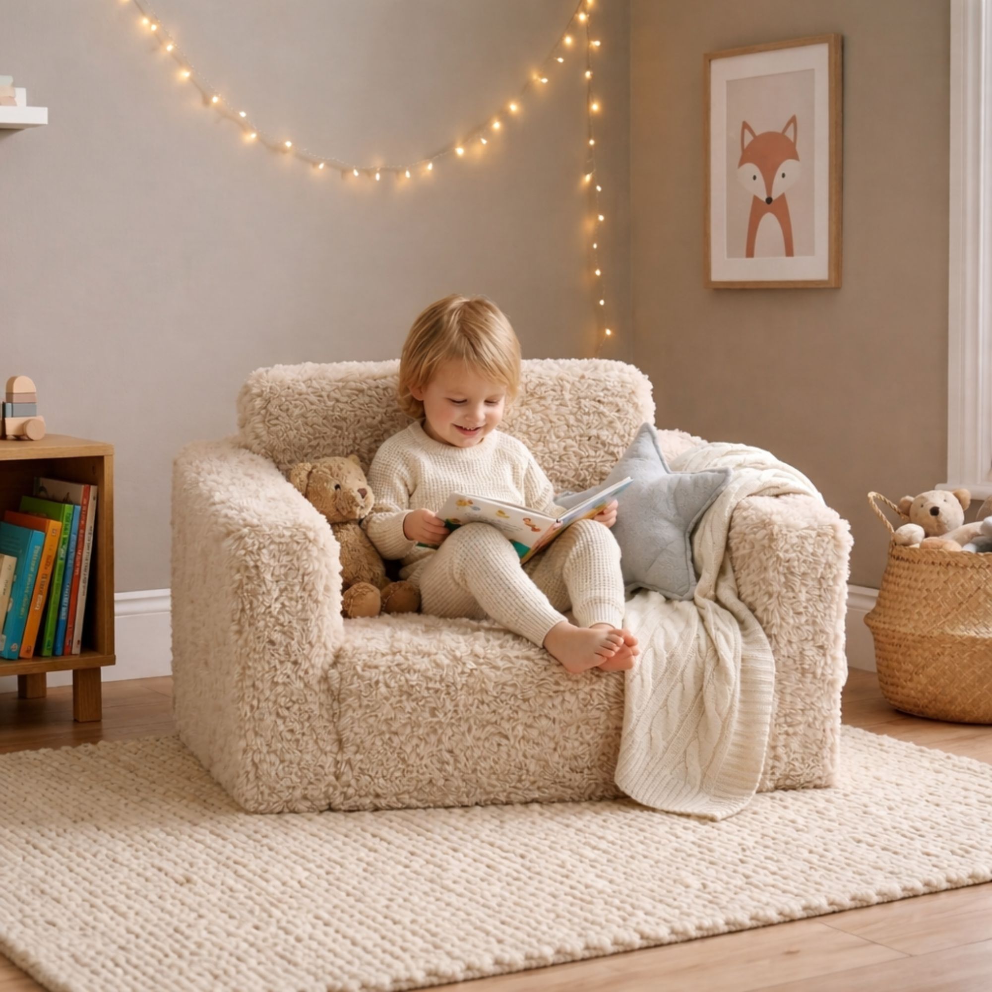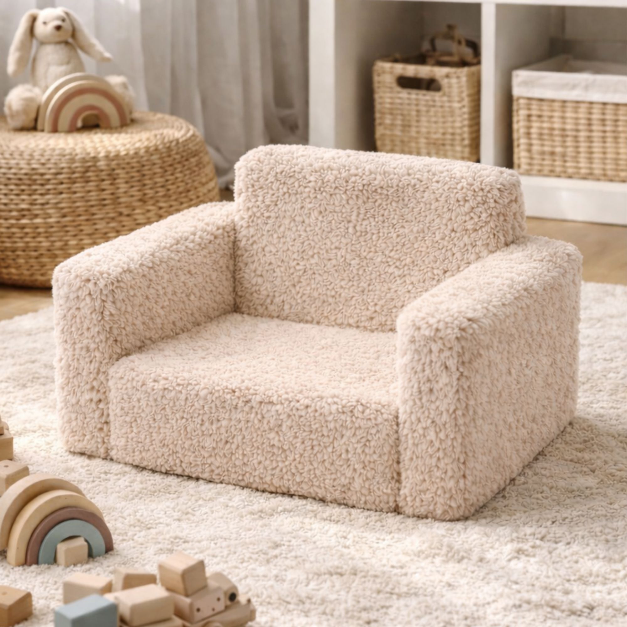 Det neutrale sandfarvet plys design giver stolen et nordisk og tidløst udtryk, der passer naturligt ind i moderne indretning - både på børneværelset og i stuen.