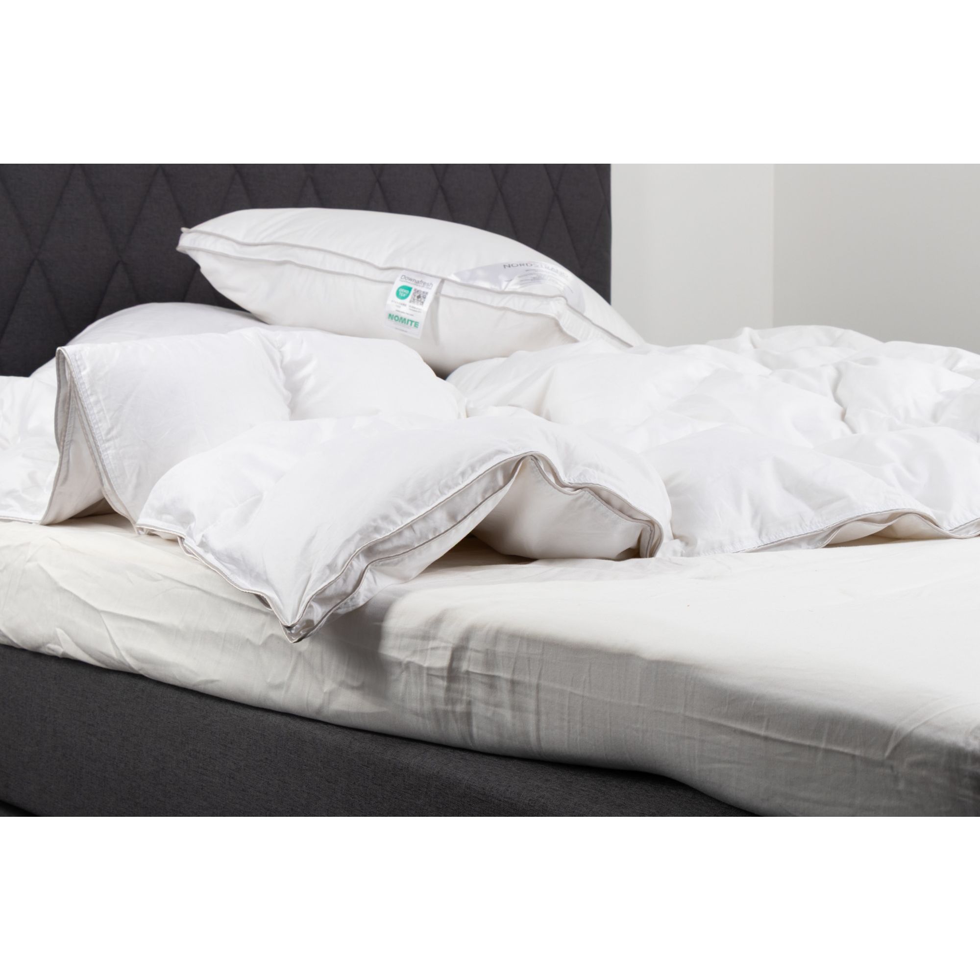 Moskusdynen er produceret med et flot hvidt bolster (vår) af 100% tætvævet og meget fin bomuldssatin, samt en fin grå piping kant, alt dette giver ikke kun dynen sit elegante udtryk og ekstra bløde følelse. Denne sammensætning af bolster gør også at støvmider ikke kan trænge igennem, hvilket gør at dynen også et velegnet til allergikere.