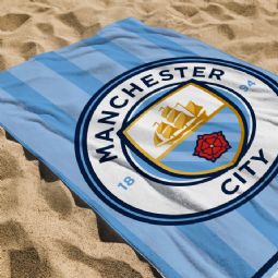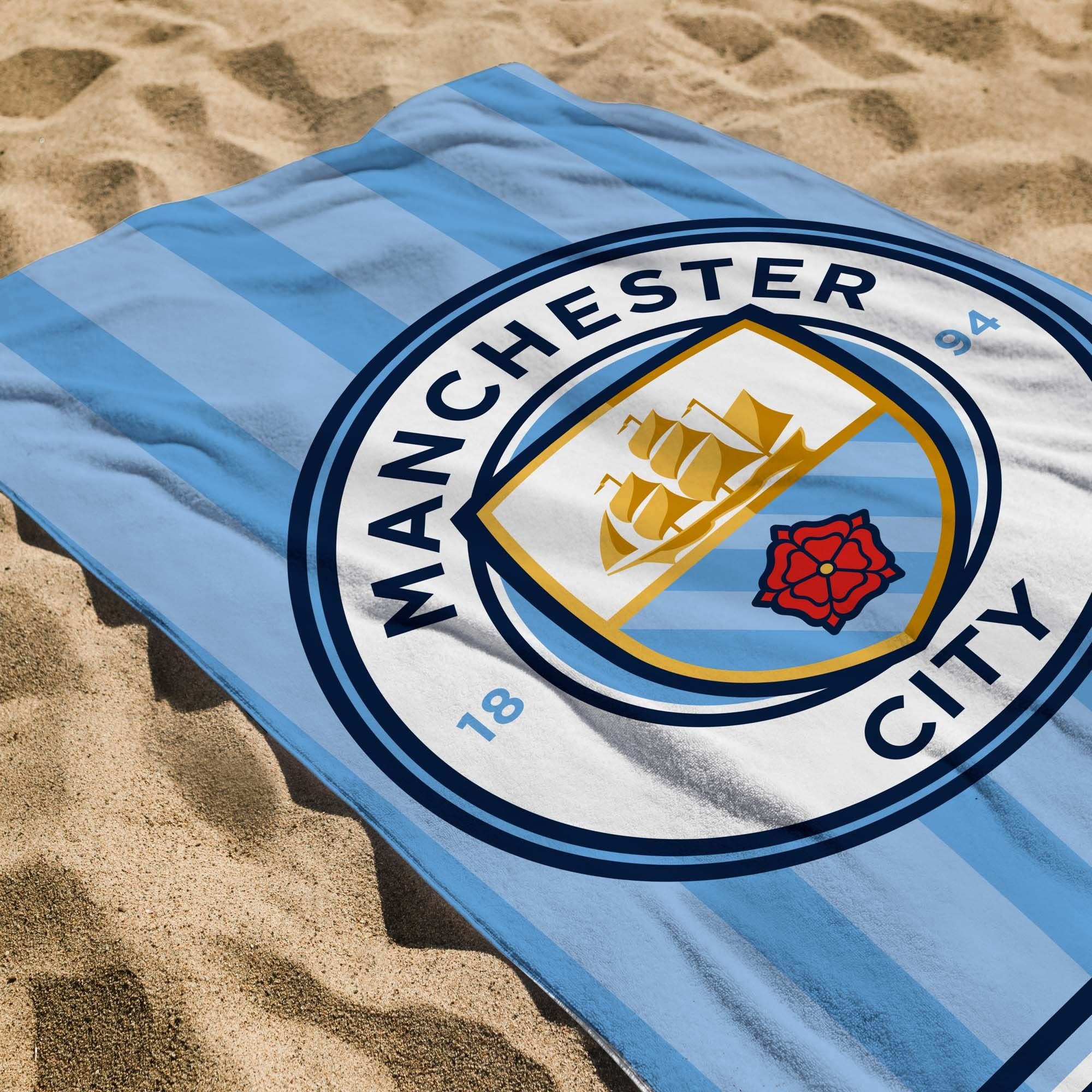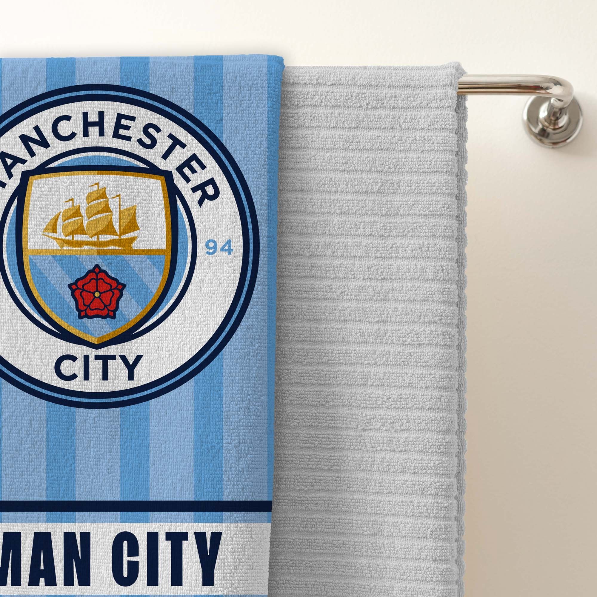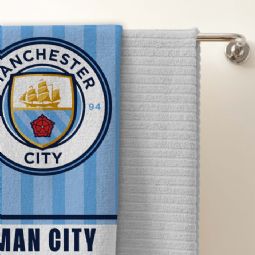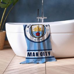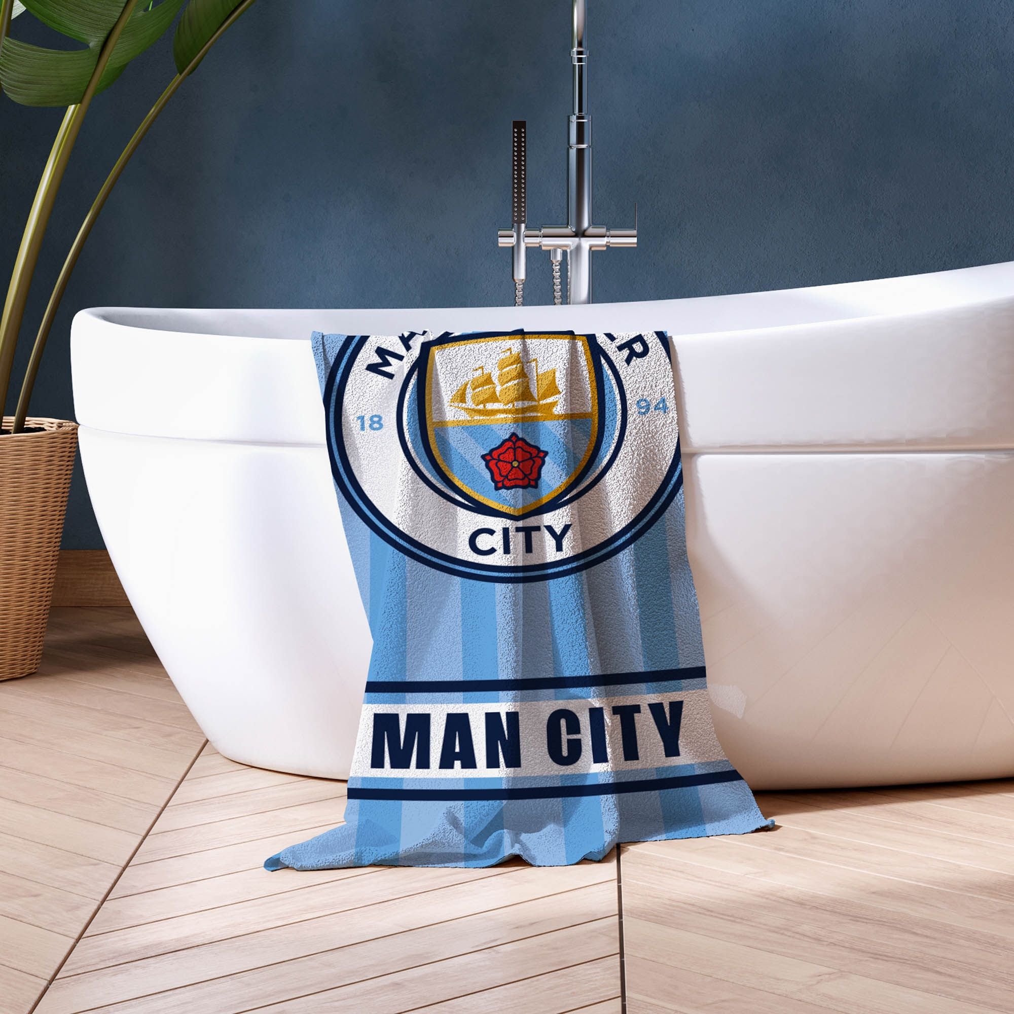 Blødt badehåndklæde i 100% bomuld, med motiv af Manchester City logo. Håndklædets fodbold motiv, vil helt sikkert bringe et smil frem på den lille fodboldfan så badetid bliver sjovere. Balancen i naturlig komfort fra det bløde materiale og det hyggelige fodbold design, gør dette håndklæde til en sikker favorit hos dit barn.