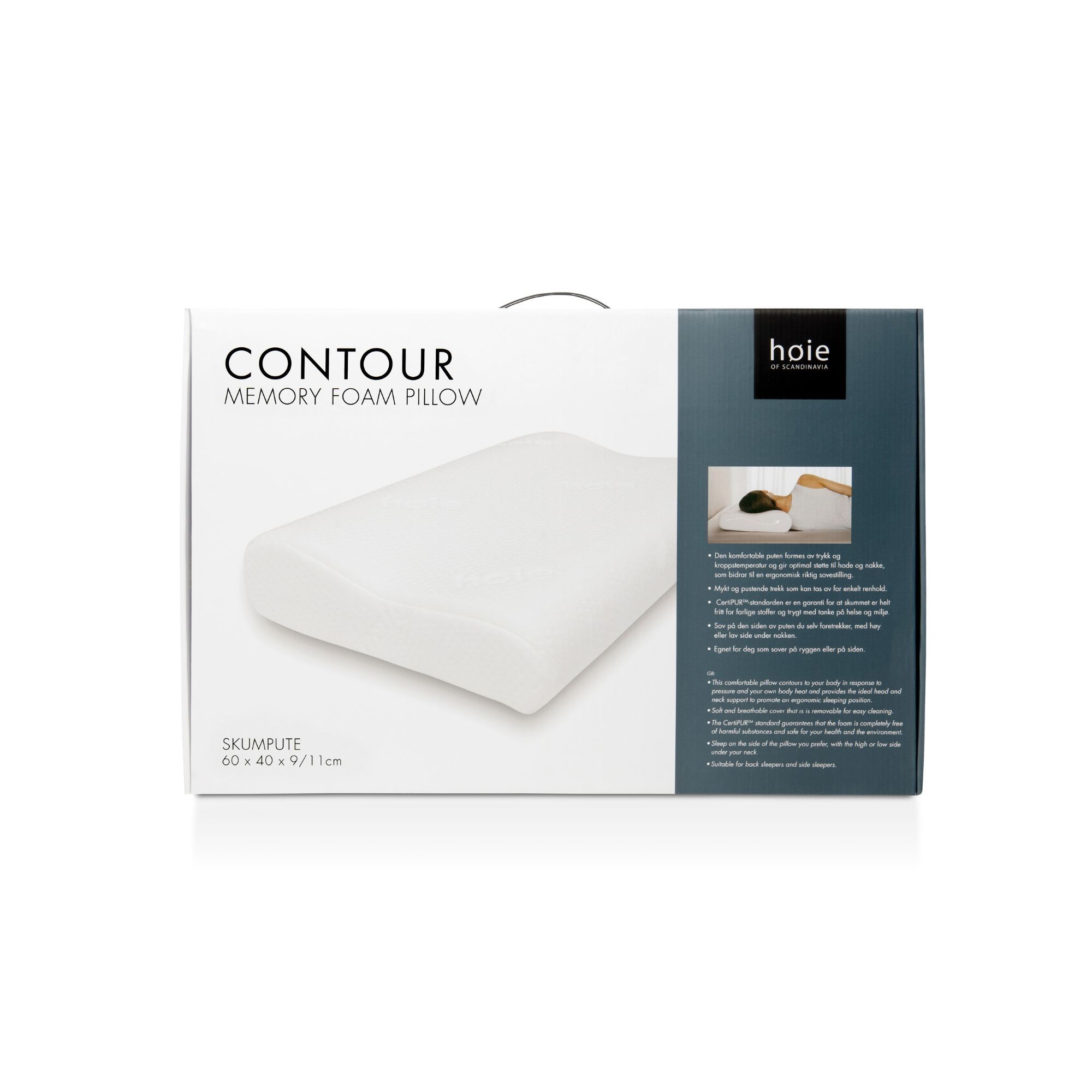 En god nats søvn afhænger i høj grad af, at du ligger godt og finder en optimal sovestilling. Høie Contour er en skumpude, der er udviklet specielt til at tilpasse sig din individuelle hoved- og nakkeprofil. Det temperaturfølsomme specialskum formes efter din krop ved hjælp af kropsvarmen, hvilket bidrager til ergonomisk korrekt støtte og jævn trykfordeling. Contour-skumpuden har en buet form, der følger de ergonomiske konturer for hoved og nakke. Den ergonomiske udformning giver dig mulighed for at vælge, om du vil have nakken på den lave eller høje side af puden - alt efter, hvordan du foretrækker at sove. Høie Contour passer godt til dig, der ønsker en medium høj pude med god støtte og foretrækker at sove på ryggen eller siden.