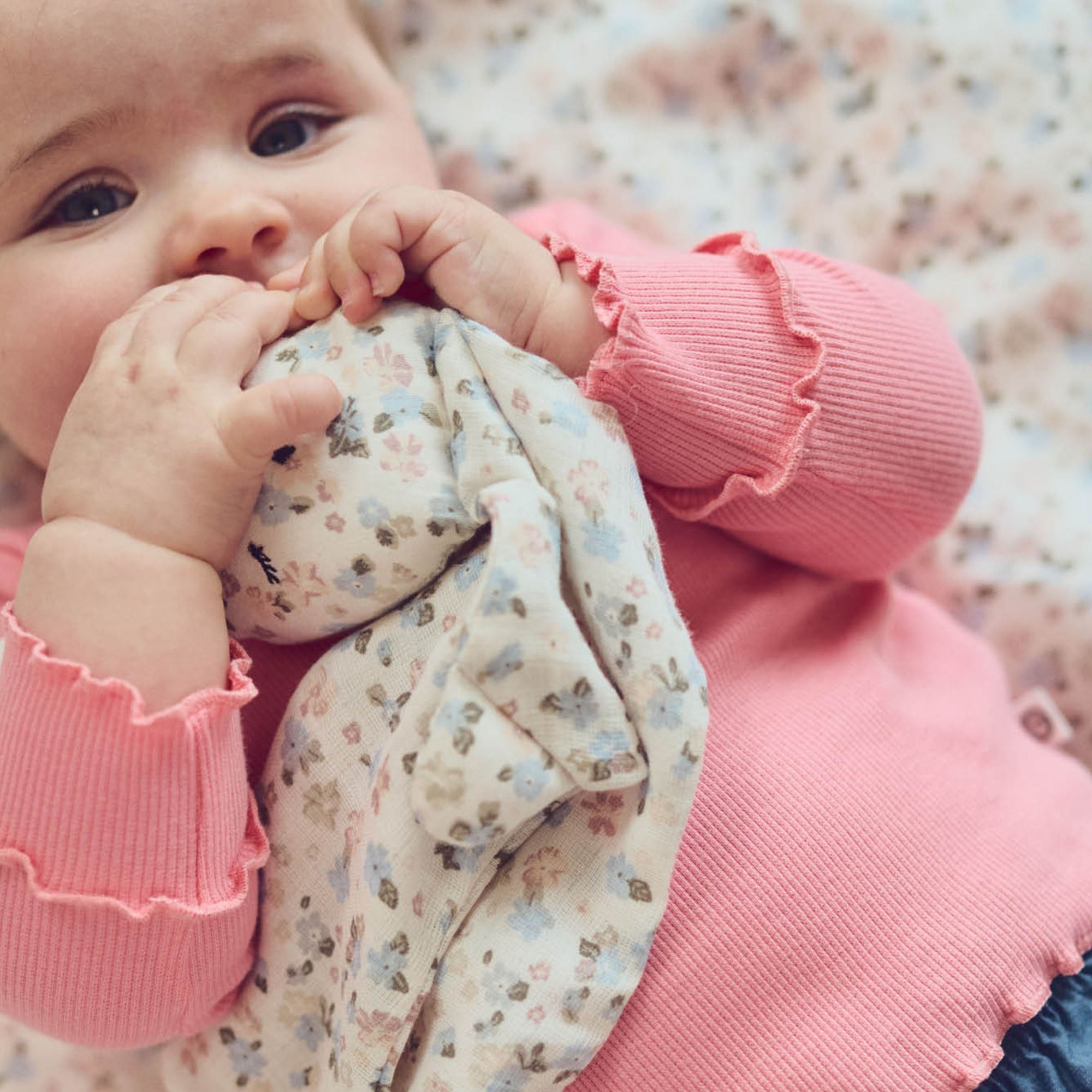 Giv din baby en følelse af tryghed med denne søde nusseklud fra Müsli. Nussekluden er designet som en kanin med fine blomster i rolige nuance, der passer perfekt ind i ethvert babyunivers. Fremstillet af 100% blød bomuld er nussekluden ekstra skånsom mod babyens sarte hud. Den bløde kvalitet gør den ideel som soveven, trøst ved uro eller som en fast følgesvend i barnevognen. Den lette struktur gør det nemt for små hænder at gribe fat i både kluden og de små bamse-detaljer.