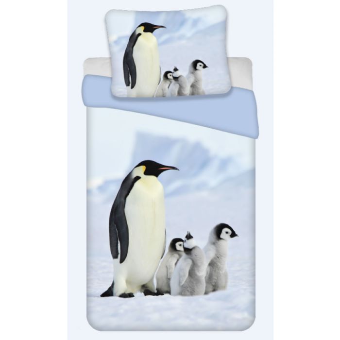 Blødt bomulds børnesengetøj med pingviner. Det søde dyremotiv giver et smil på læben hos de dyreelskende sjæle. Dette sengesæt er vendbart og har en fin lyseblå ensfarvet bagside. På forsiden er der et motiv af pingviner på den kolde is.