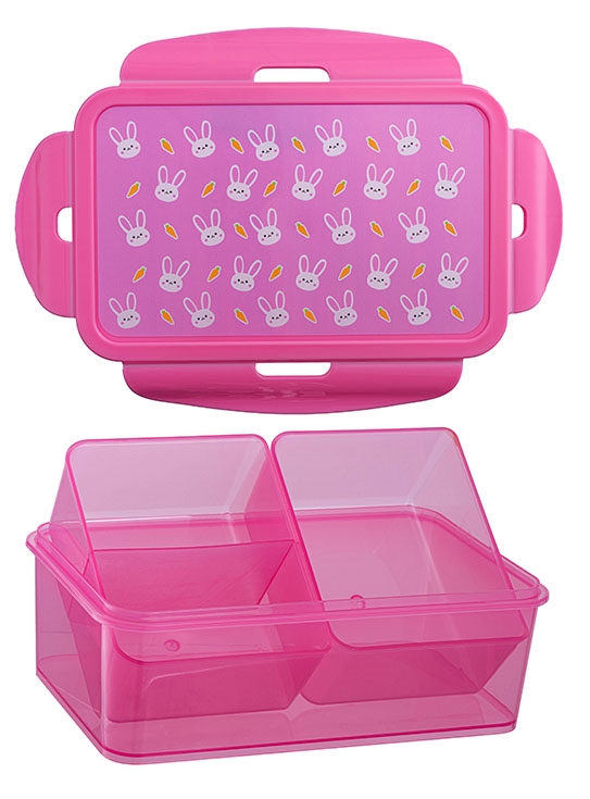 Gør frokosten lidt mere sjov med en madkasse med motiv. Madkassen har et sødt motiv af kaniner. Madkassen er produceret i let og slidestærkt plast, som gør den ideel til daglig brug. Den har et stort rum, så der er god plads til både sandwich, frugt, snacks eller indsæt de små medfølgende beholdere og del maden op. Låget slutter tæt og er nemt for børn at åbne og lukke selv.