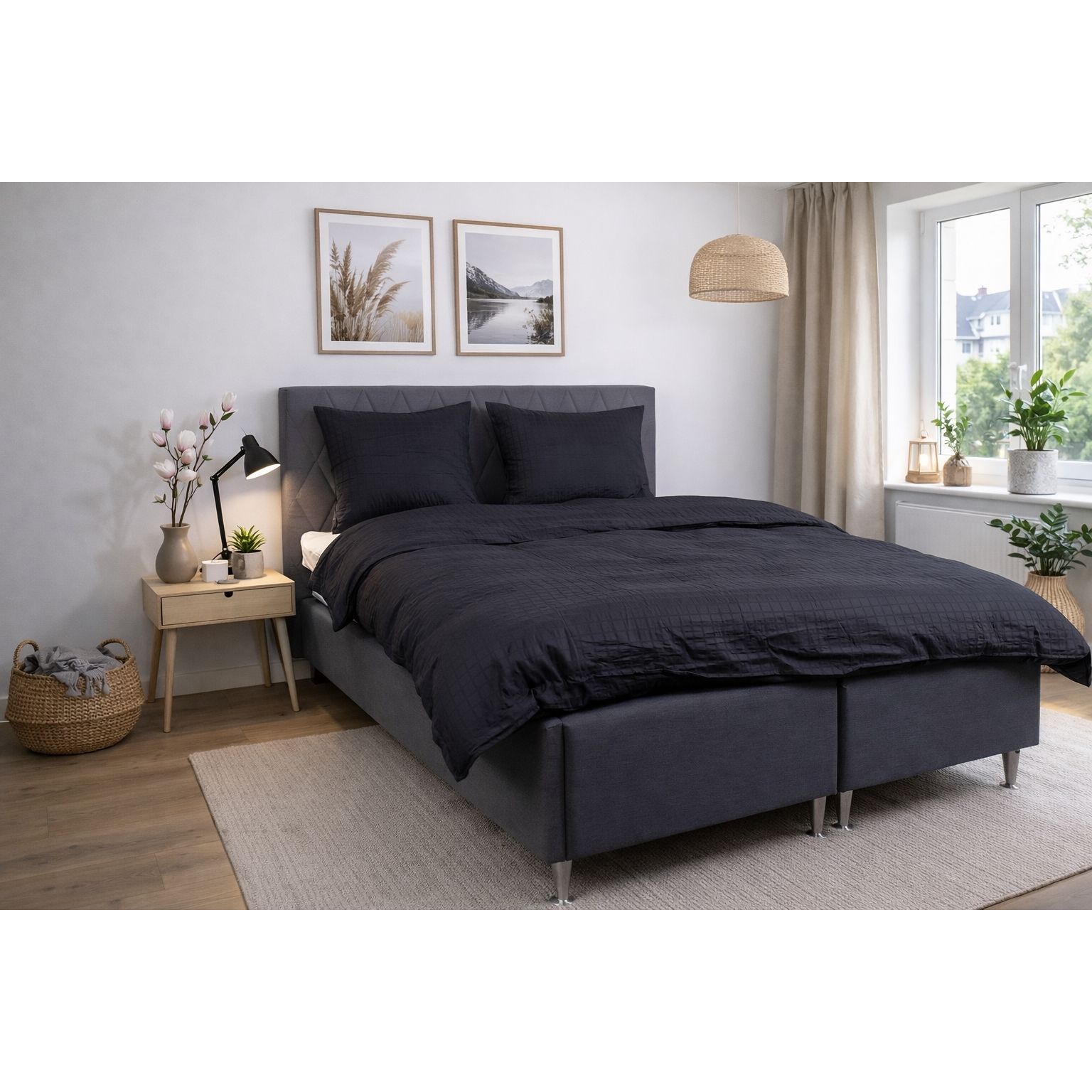 Pudebetrækket er fremstillet i 100% bomuldssatin med et jacquardvævet ternet mønster, hvor designet er vævet direkte ind i stoffet. Ternene skaber et elegant spil i overfladen og giver pudebetrækket et stilrent og tidløst udtryk, der passer perfekt til både moderne og klassiske soveværelser.