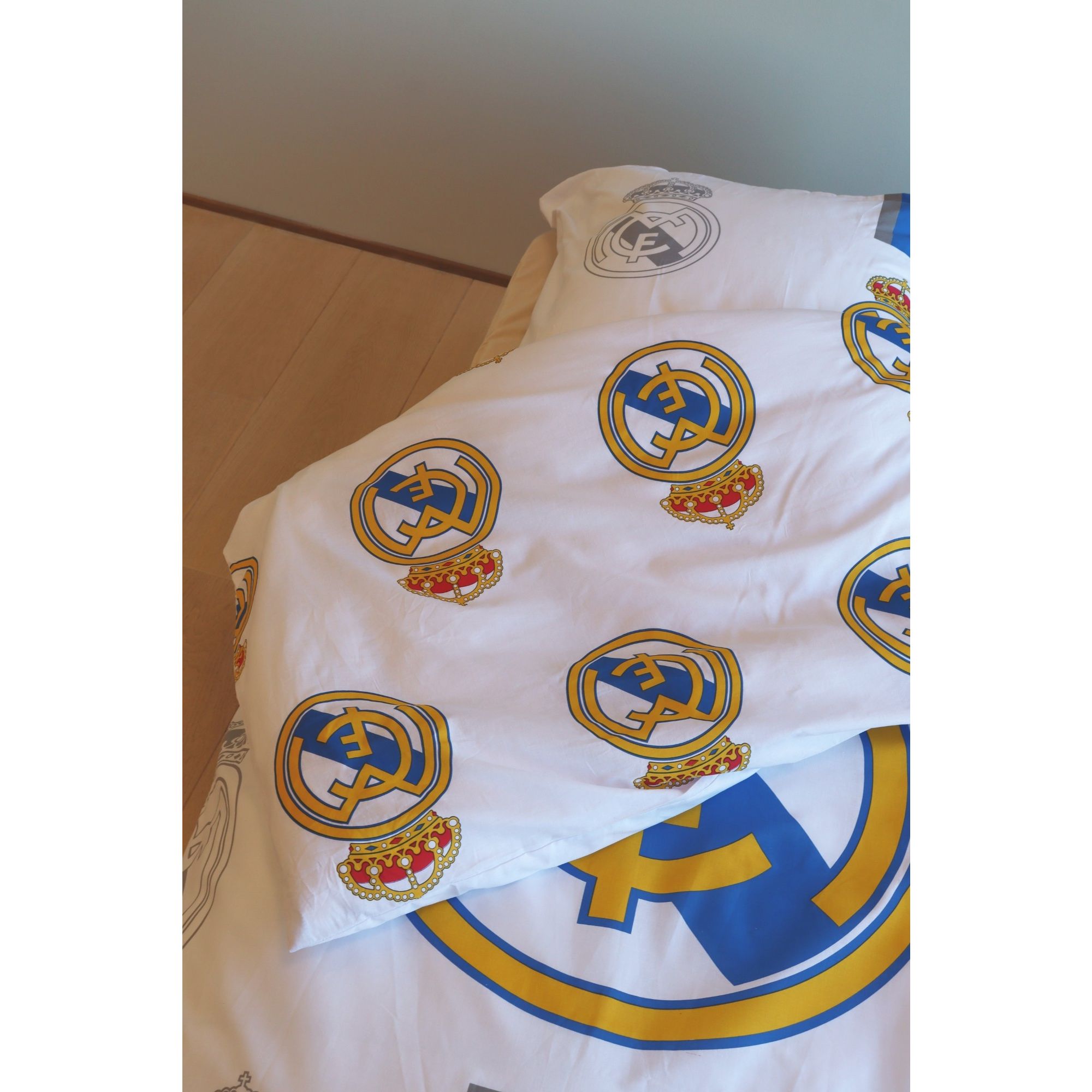 Få børneværelset til at stråle af fodboldstemning med dette Real Madrid sengetøj 140x200 cm i flotte hvide-, blå- og gråtoner. Perfekt til unge fodboldentusiaster, der vil vise deres kærlighed til Real Madrid CF, mens de sover trygt og komfortabelt.