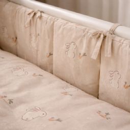Betrækket er fremstillet i 100% blød bomuld, som føles behageligt og naturligt mod barnets hud. Det fine design i sand nuancer med kaniner giver et sødt og roligt udtryk i børneværelset.