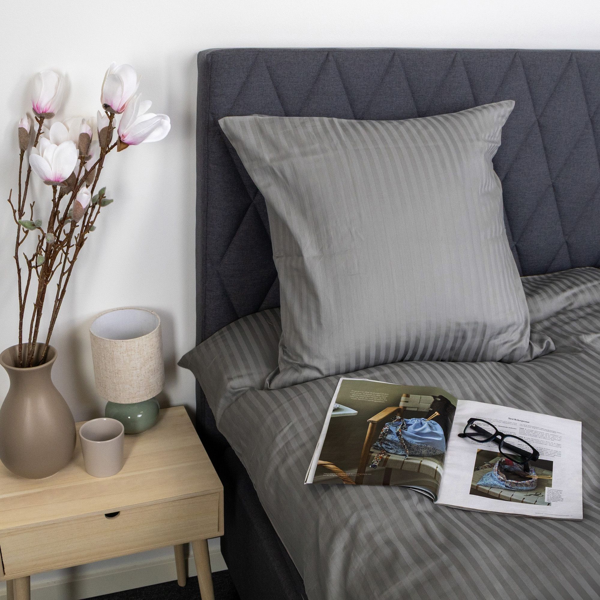 De jacquardvævede striber er vævet direkte ind i stoffet og skaber et diskret spil mellem matte og blanke flader. Denne væveteknik giver sengetøjet struktur og dybde uden brug af print og sikrer, at mønsteret forbliver flot og ensartet, selv efter gentagen vask. Det ensfarvede design gør det nemt at få sengesættet til at passe ind i alle former for indretning.