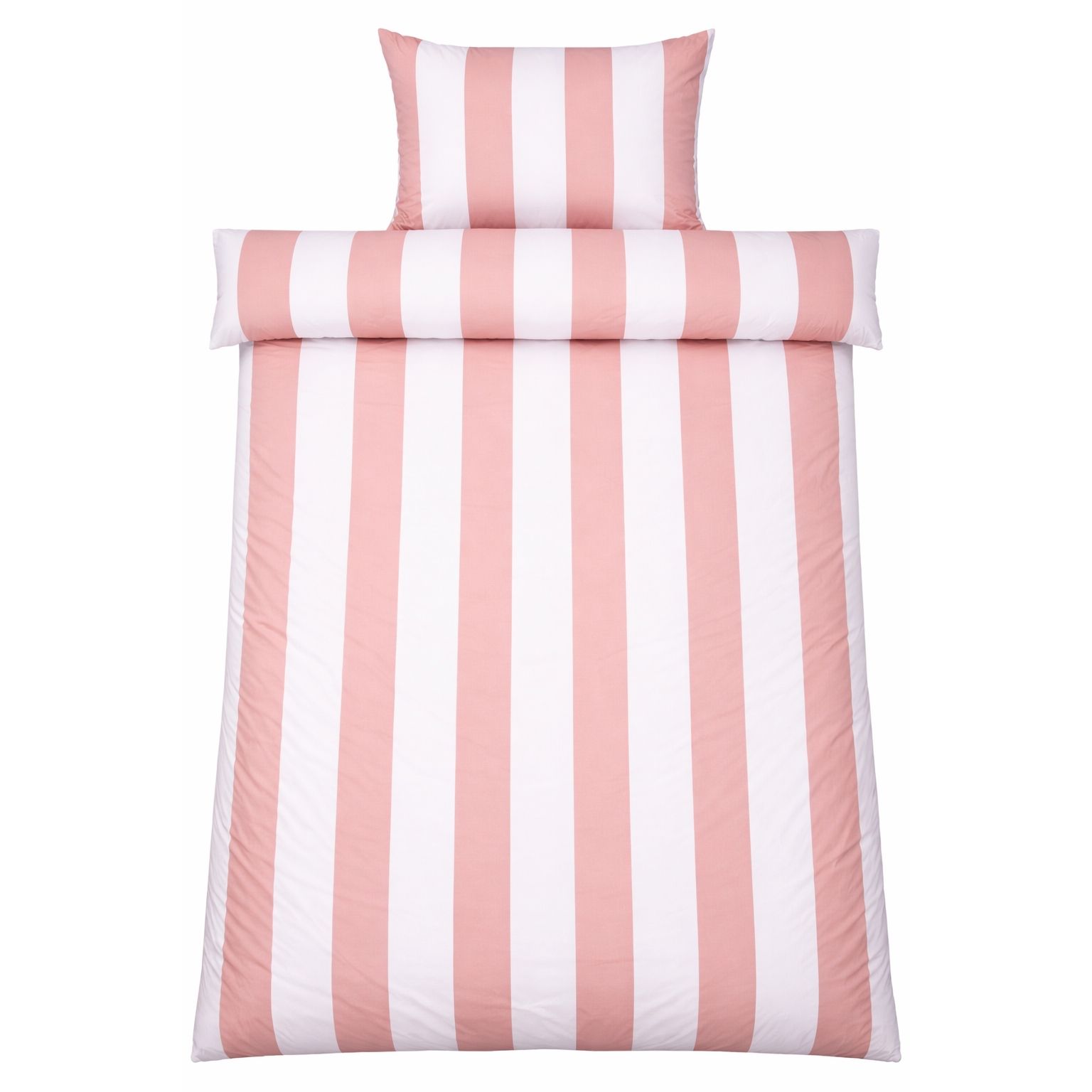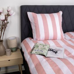 Det brede stribede print giver et skarpt og harmonisk udtryk. Kombinationen af lyserøde og hvide striber giver soveværelset et afslappet og roligt udtryk, samtidig med at designet er let at kombinere med forskellige puder.