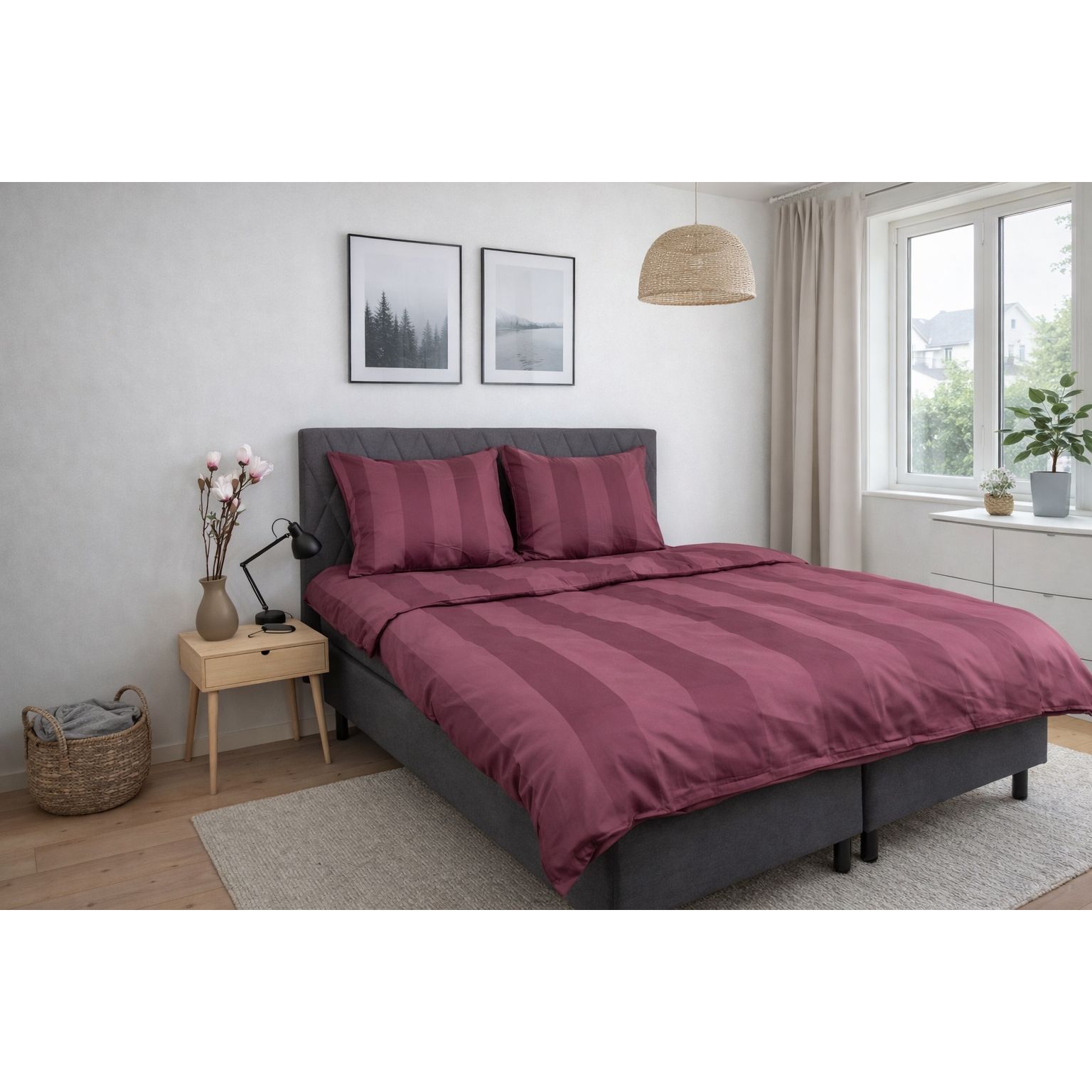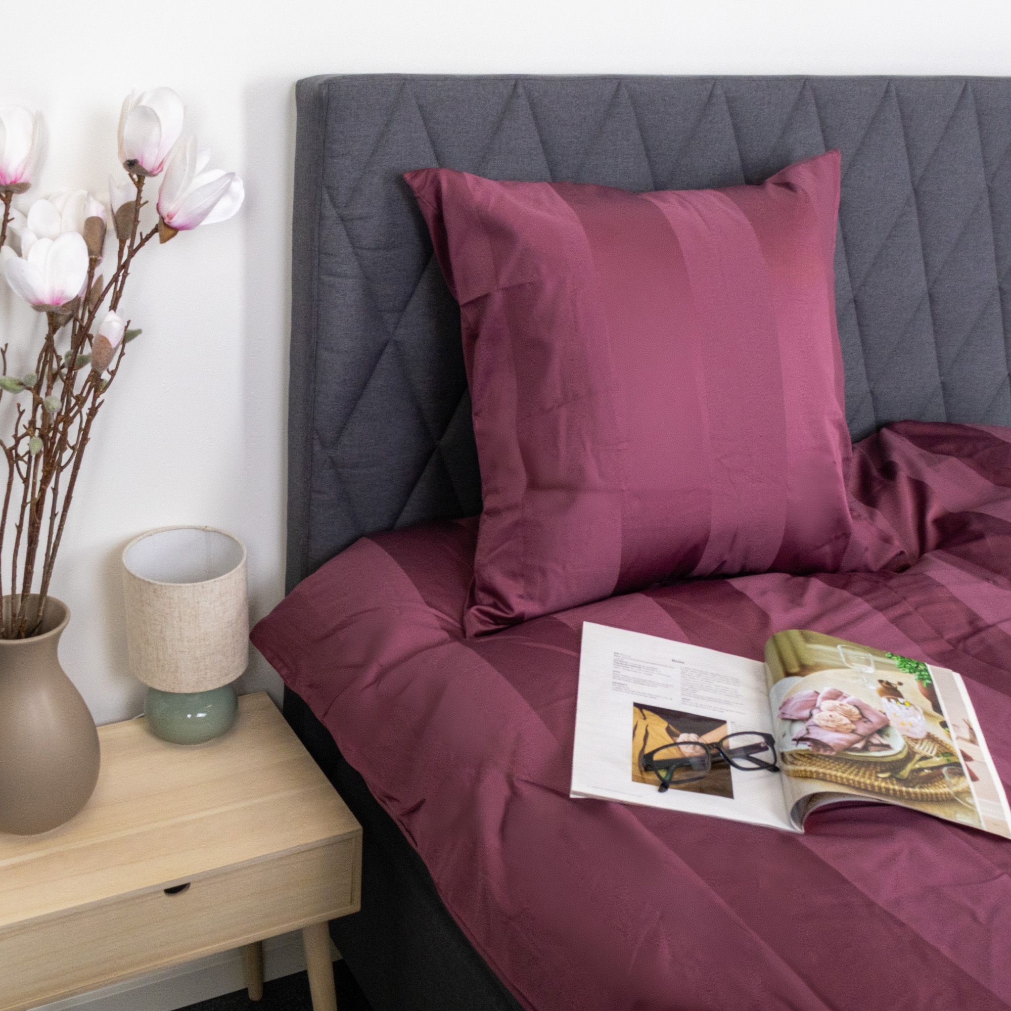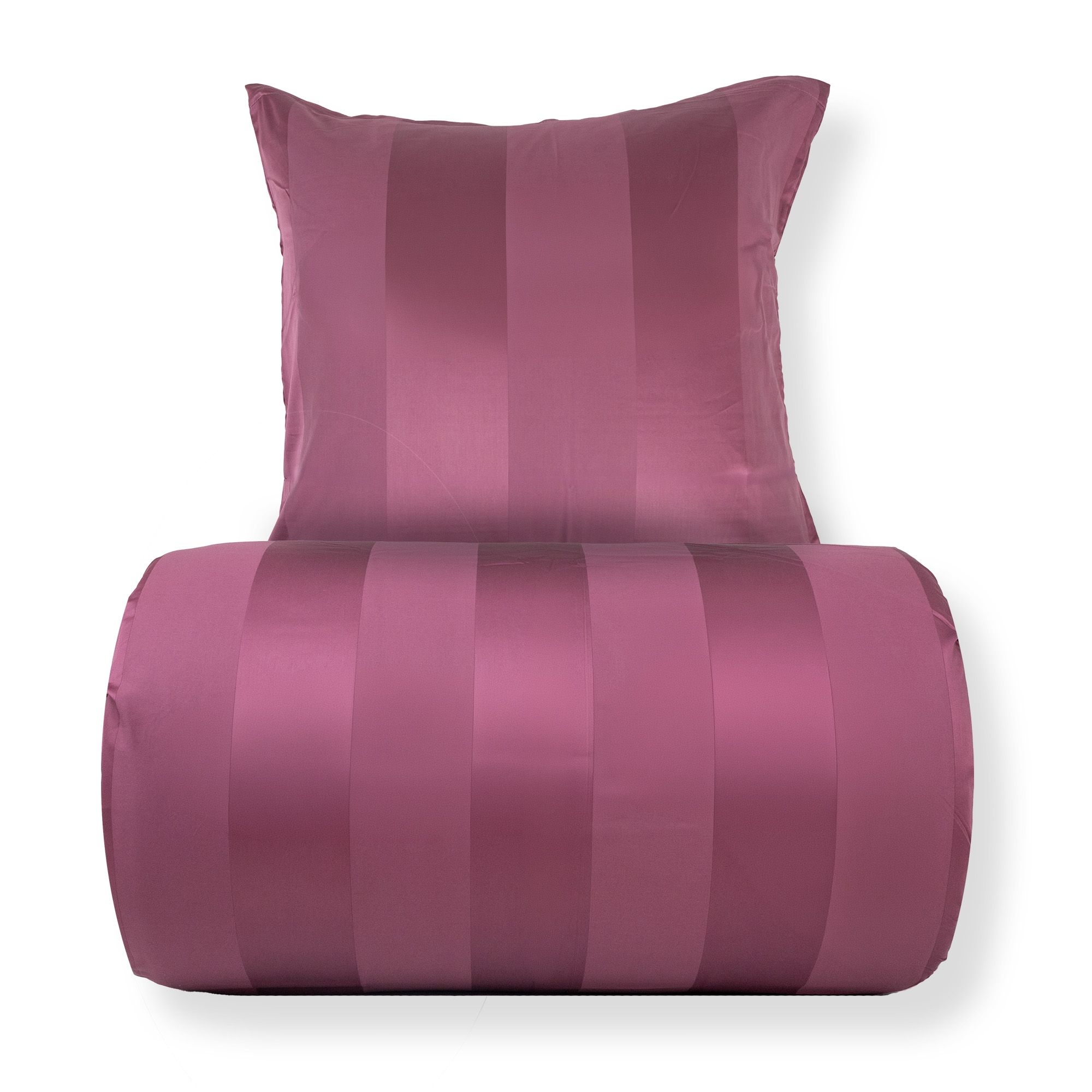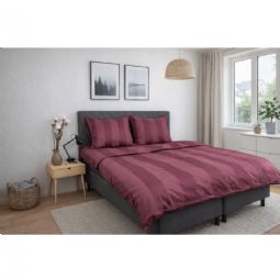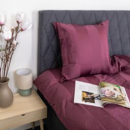 Skab en eksklusiv hotelstemning i soveværelset med dette blommefarvet stribede sengetøj i 100% bomuldssatin. Det elegante design med brede jacquardvævede striber kombinerer tidløs minimalisme med luksuriøs komfort og er perfekt til dig, der ønsker et stilrent og indbydende sovemiljø.