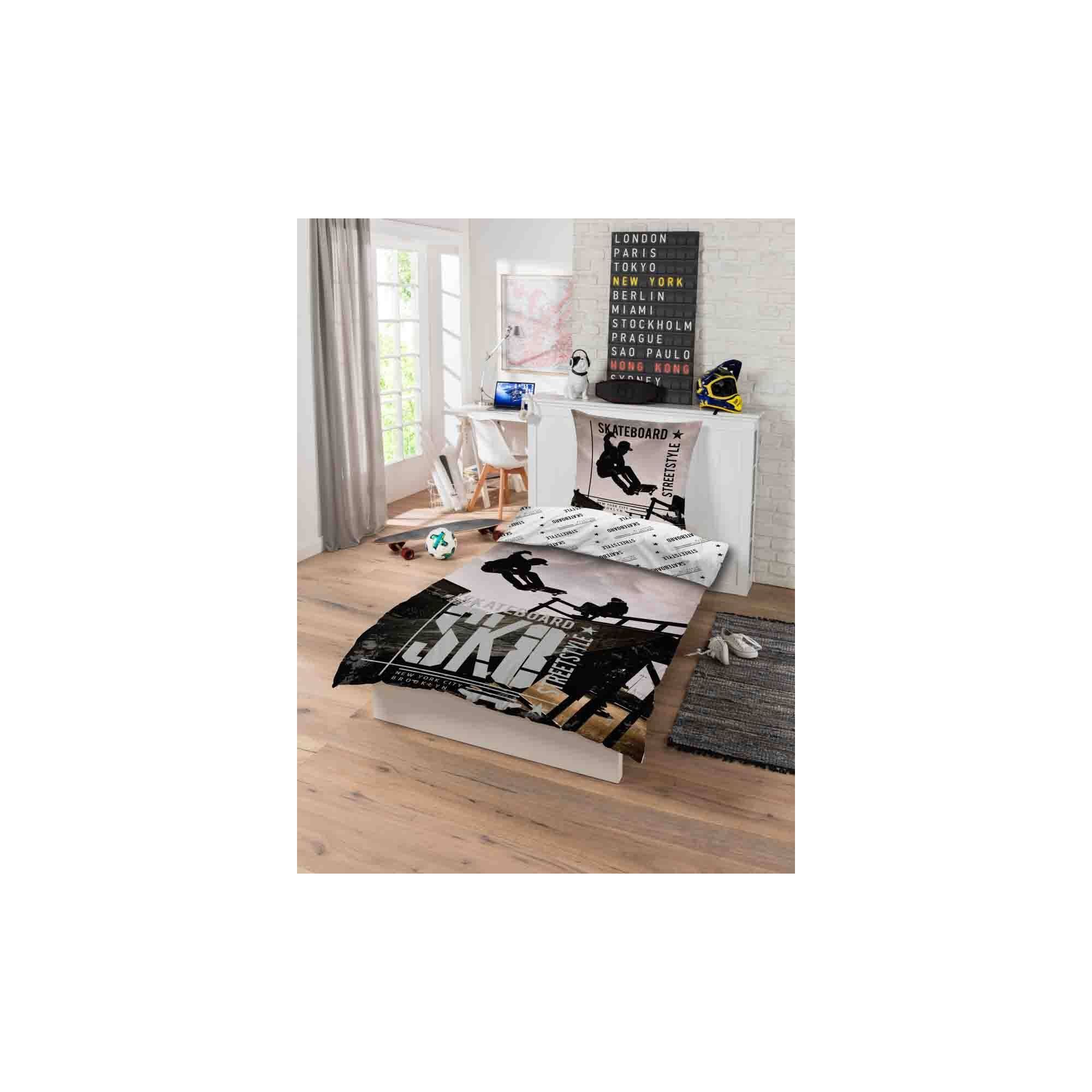 Sengetøj med et sejt motiv af en skater på rampen, i fuld fart. Et børnesengesæt til skateboarding fanen. Det bløde sengesæt produceret i 100% bomuld er både åndbart og absorberende, og med god sovekomfort. Et slidstærkt bomulds børnesengesæt, som gør børneværelset lidt mere spændende.