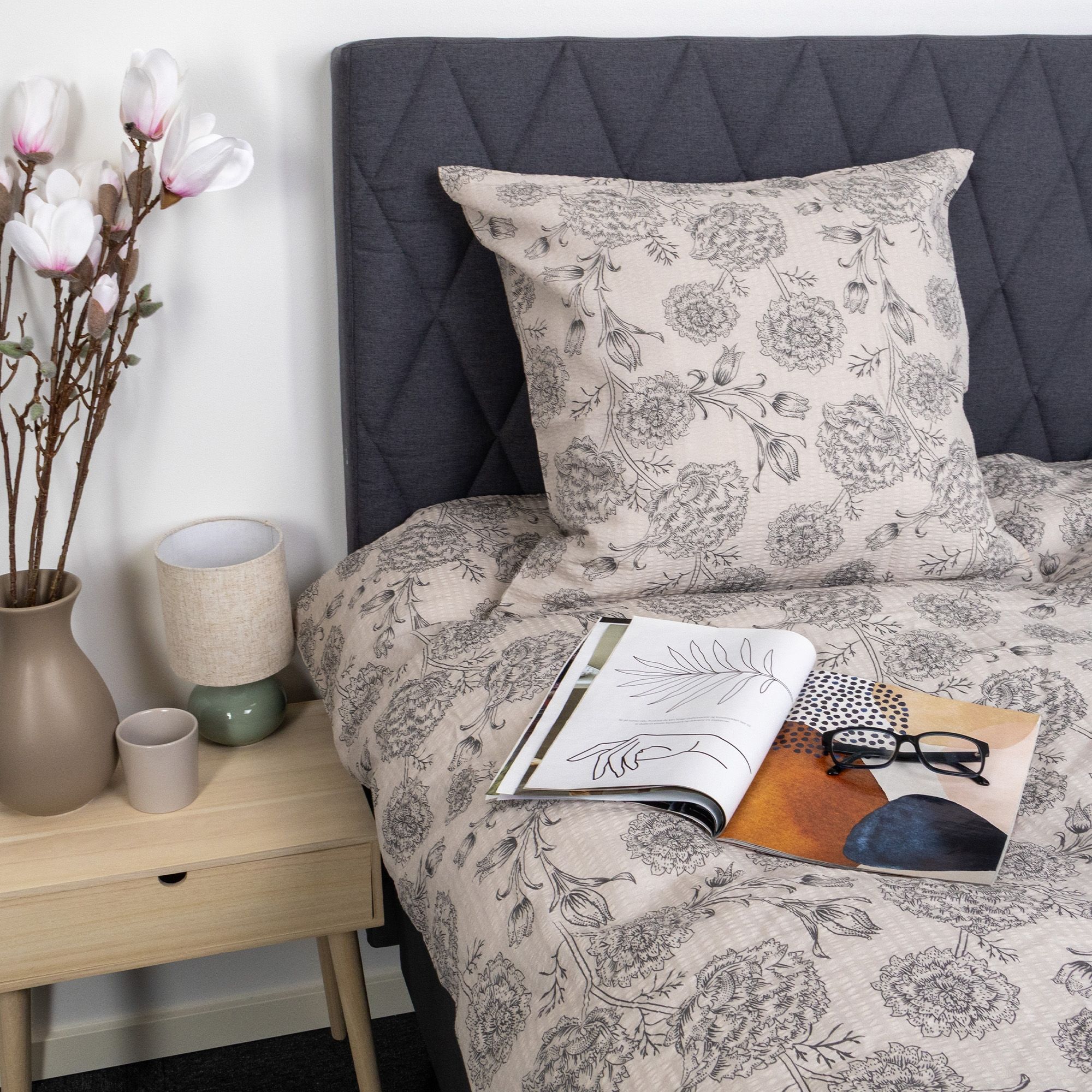 Dyne- og pudebetræk lukkes med lynlås, som gør det nemt at skifte sengetøj og holder både dyne og pude sikkert på plads natten igennem. Det blomstrede design giver et roligt og tidløst udtryk, der passer godt ind i både moderne og klassiske soveværelser.