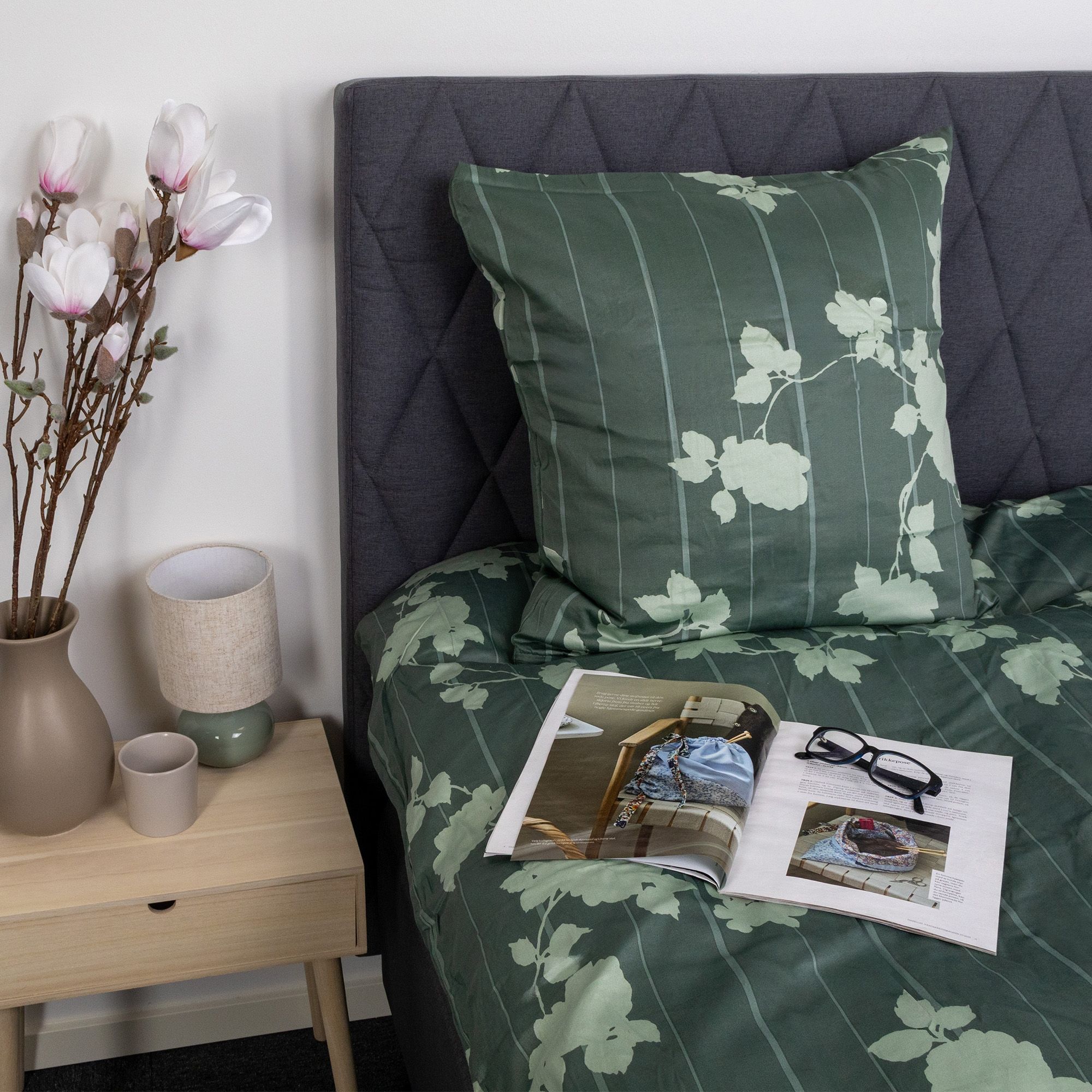Skab et roligt og eksklusivt udtryk i soveværelset med dette blomstret luksus sengesæt i 100% bomuldssatin fra By Borg. Det stilfulde blomstret og stribet design i grøn giver et tidløst look, der passer perfekt ind i både moderne og klassiske soveværelser.