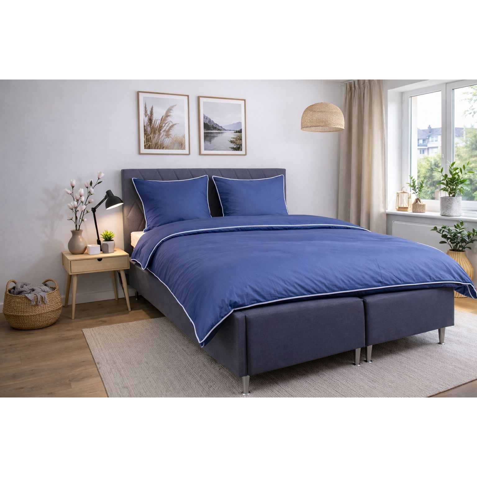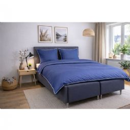 Skab et elegant og luksuriøst udtryk i soveværelset med dette eksklusive sengesæt i 100% bomuldssatin med dekorativ pipingkant fra By Borg. Det ensfarvede design i dyb blå kombineret med en lysere pipingkant tilfører et stilrent og sofistikeret look, der løfter helhedsindtrykket i soveværelset.