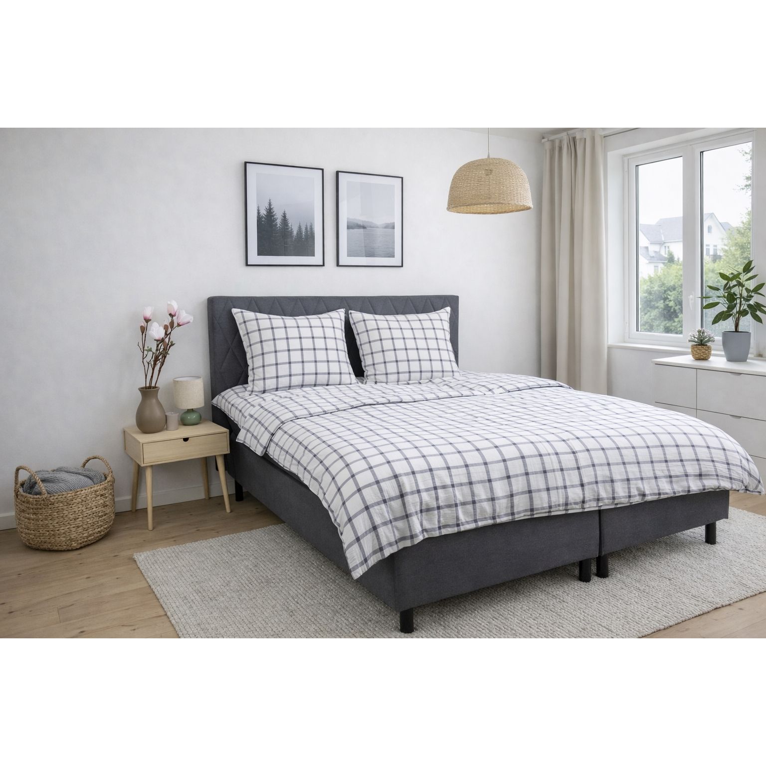 Dyne- og pudebetræk lukkes med lynlås, som gør det nemt at skifte sengetøj og holder både dyne og pude sikkert på plads natten igennem. Det ternet design giver et roligt og tidløst udtryk, der passer godt ind i både moderne og klassiske soveværelser.