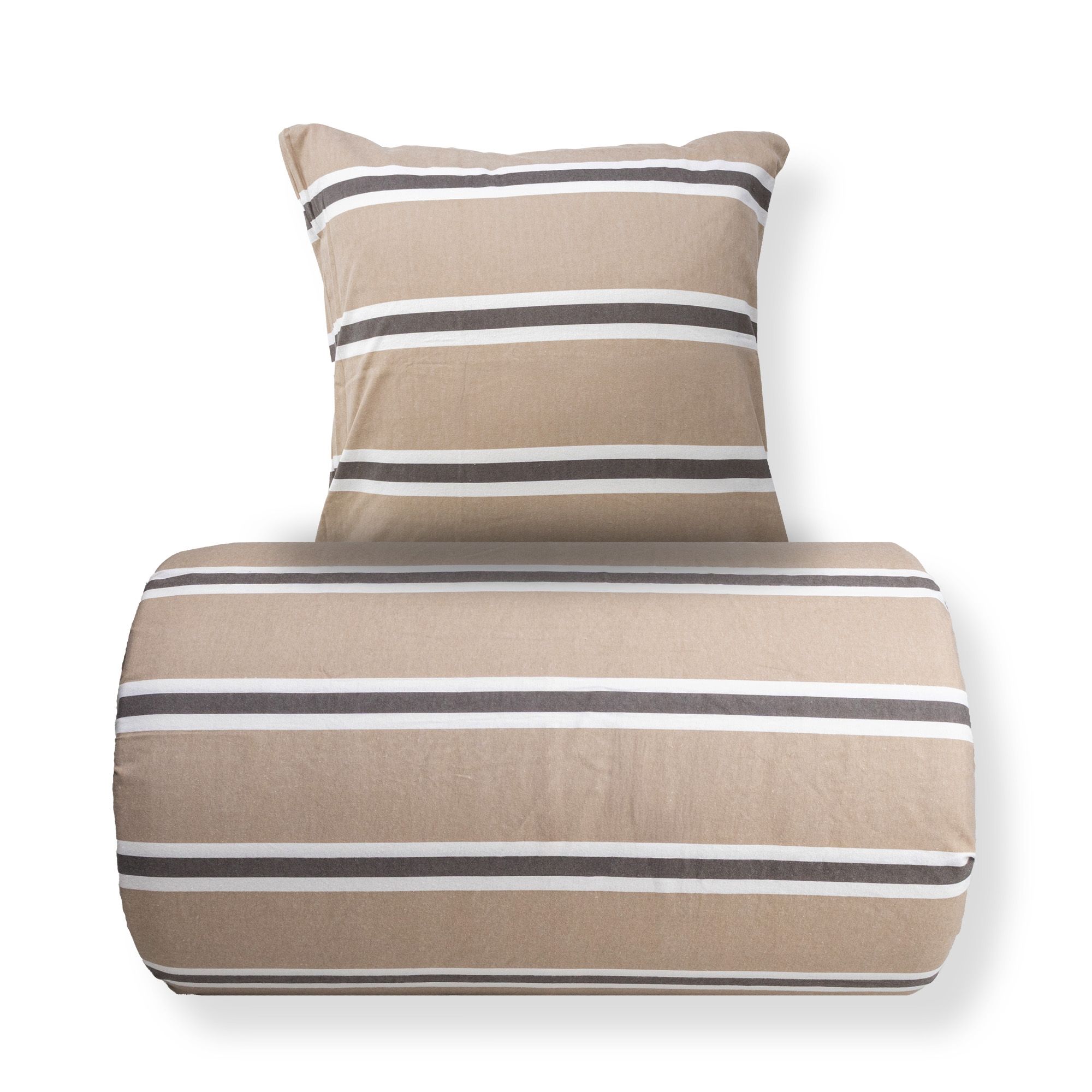 Skab en hyggelig og indbydende stemning i soveværelset med dette stribet flonel sengetøj i beige med brune og hvide detaljer. Den bløde bomuldsflonel giver en lun og behagelig komfort - perfekt til kølige nætter.
