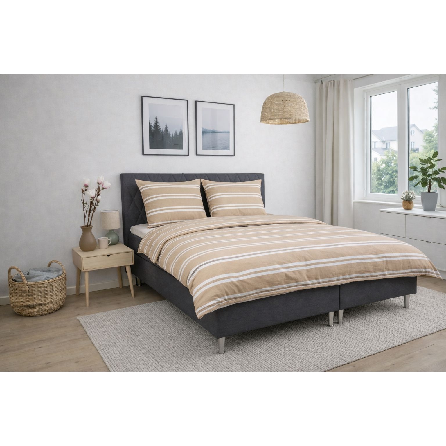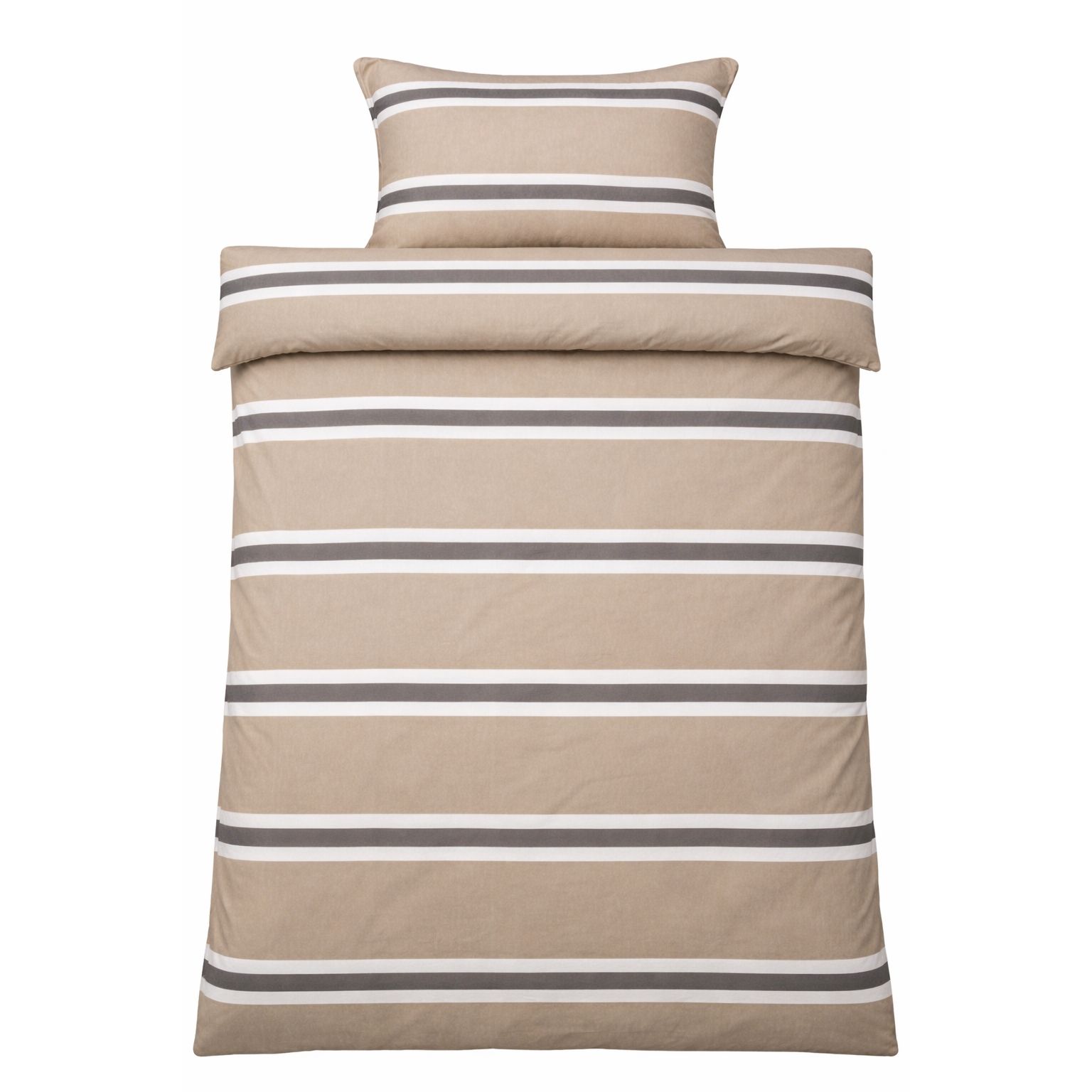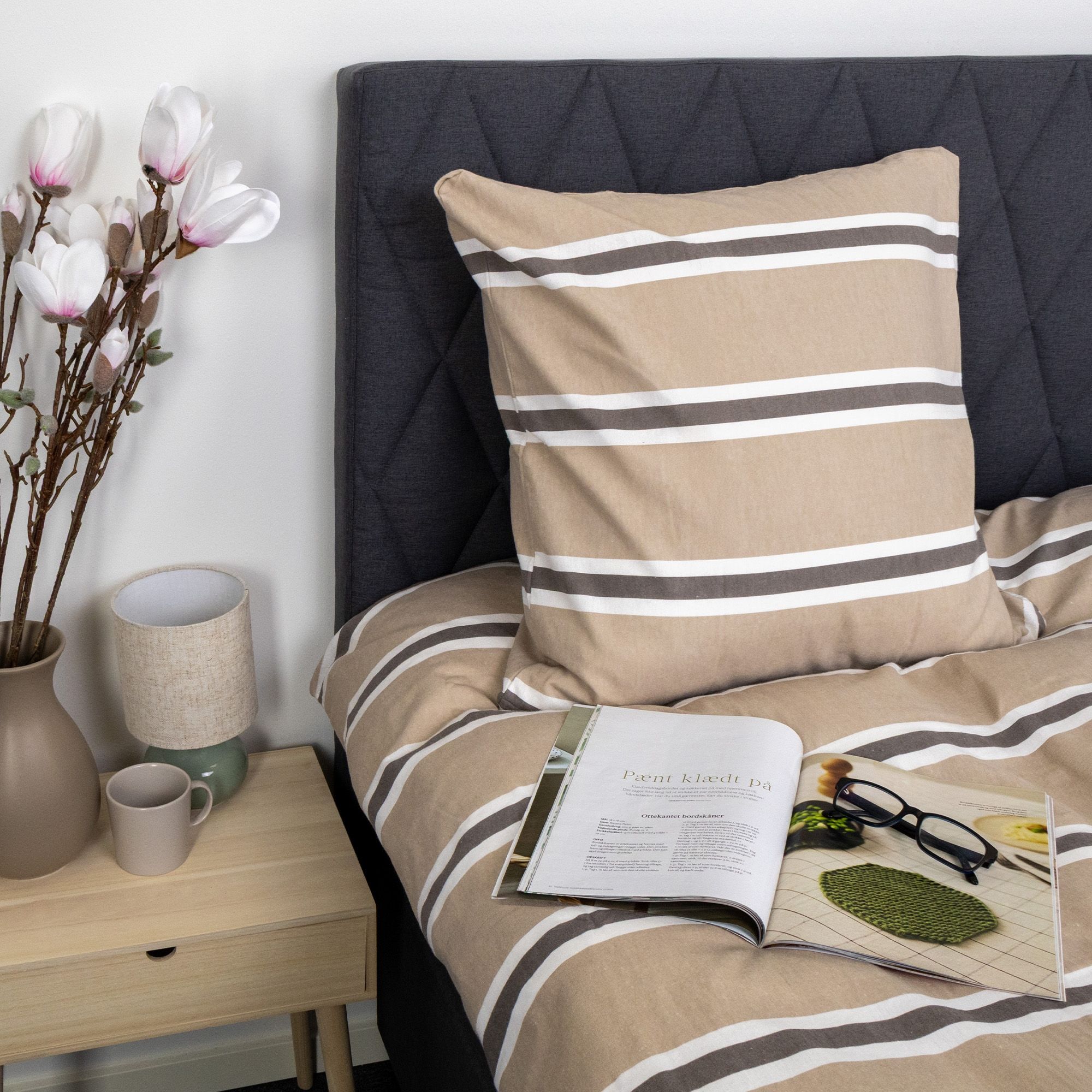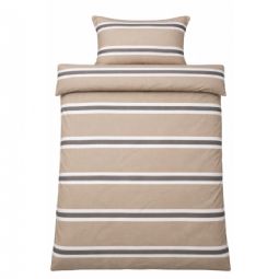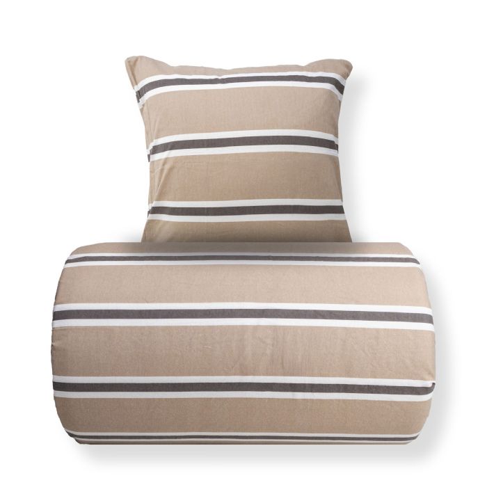 Det stribet design kombinerer flotte brune og hvide striber med en beige baggrund, hvilket skaber et roligt og harmonisk udtryk i soveværelset. Et stribet sengetøj, der både føles lunt og ser elegant ud.