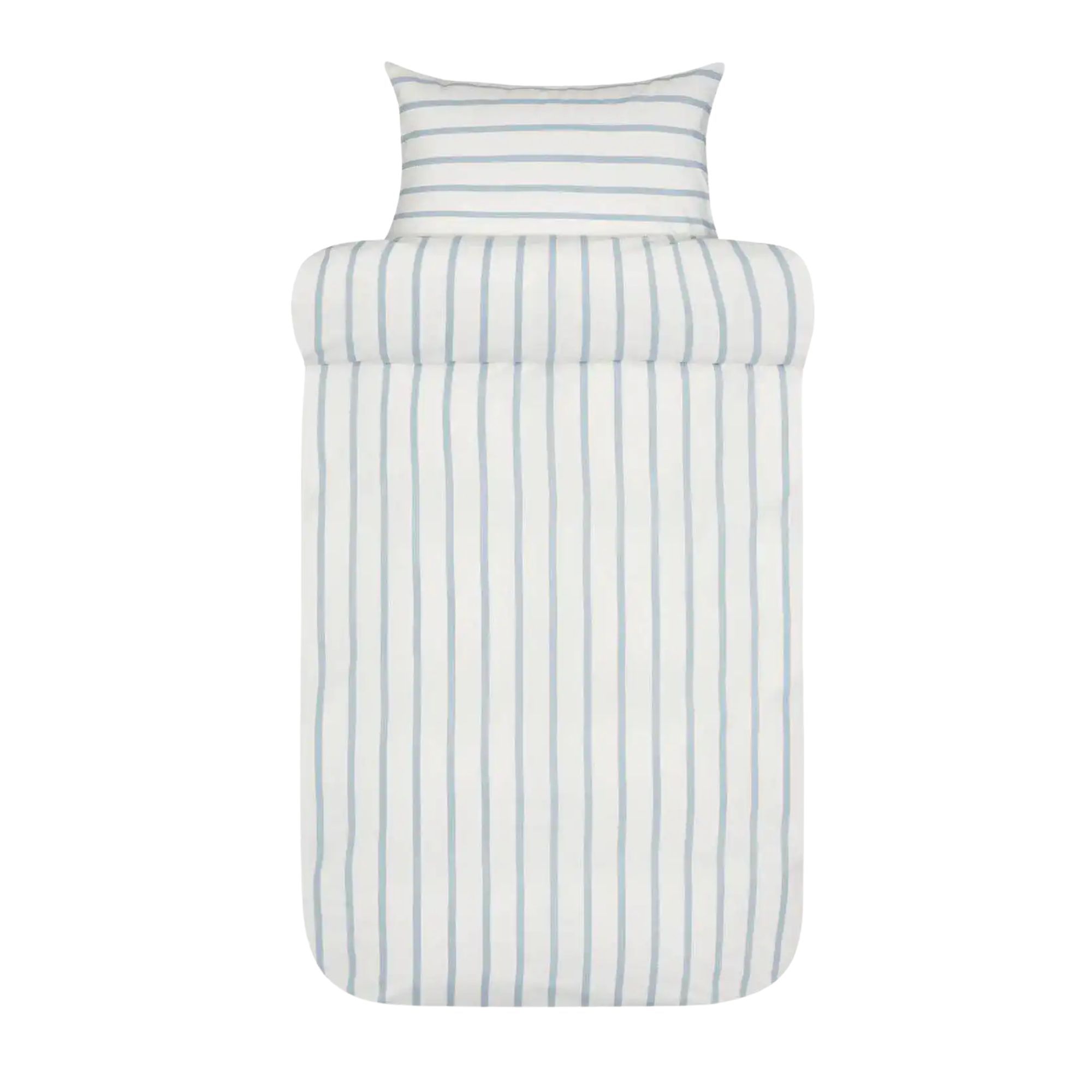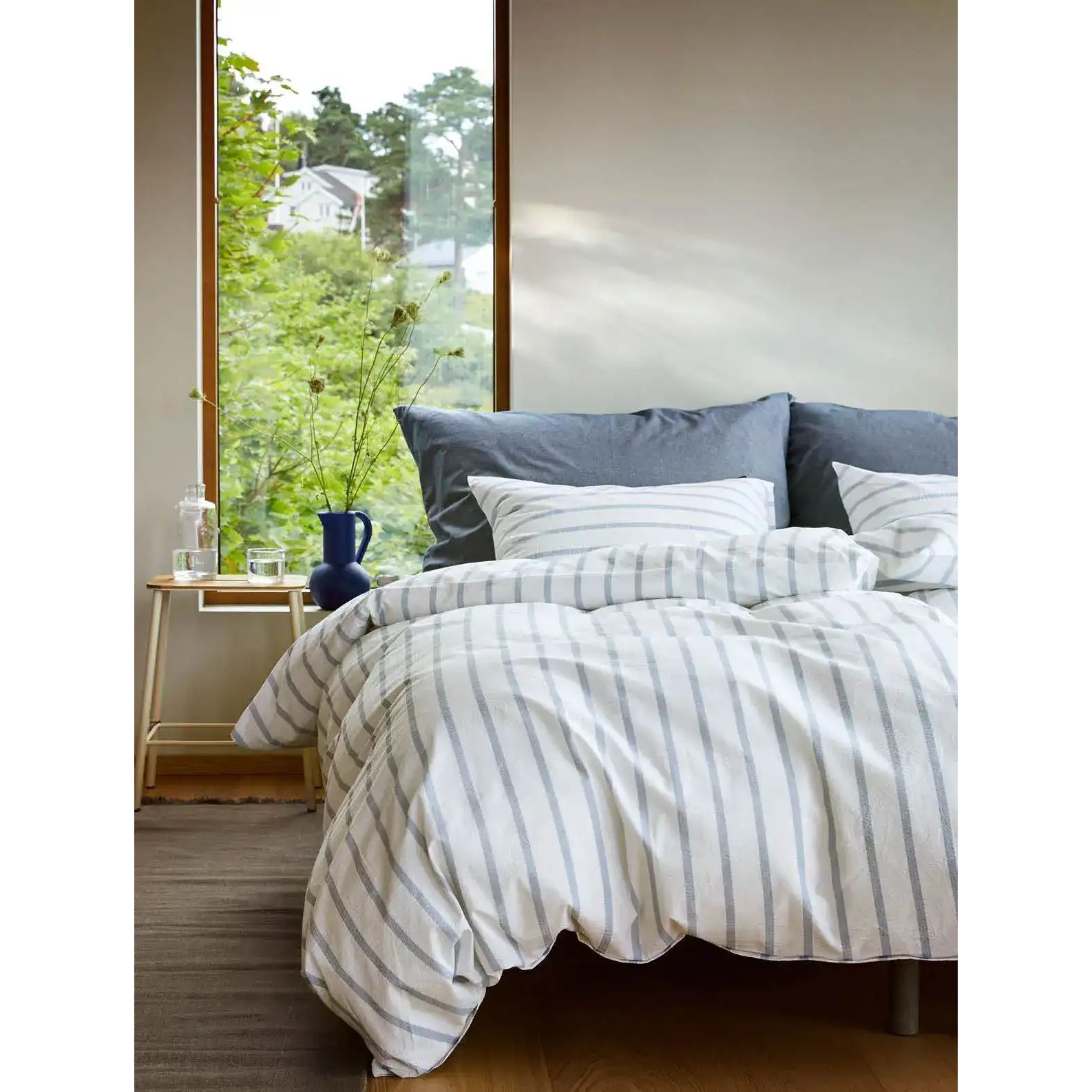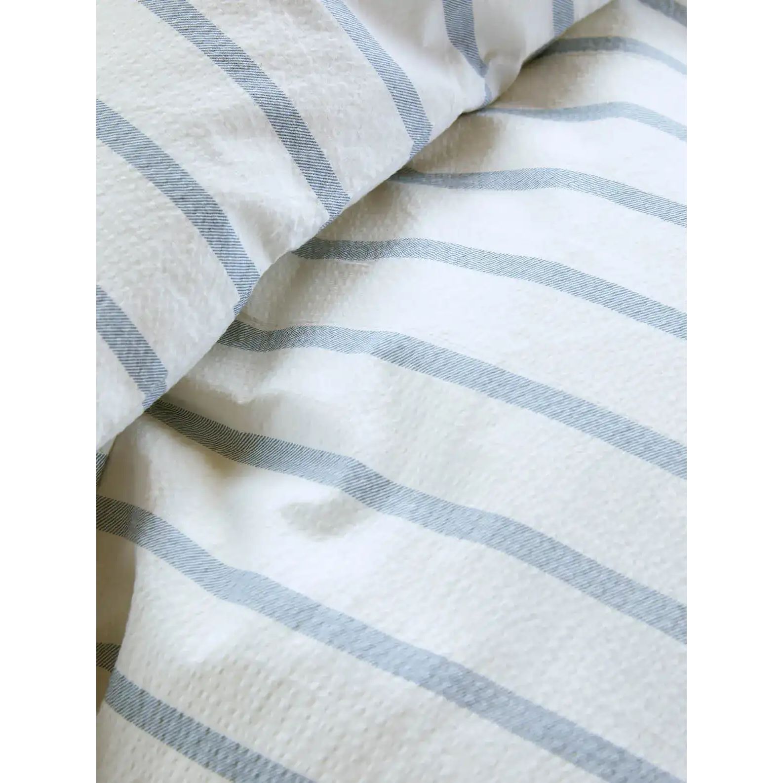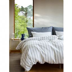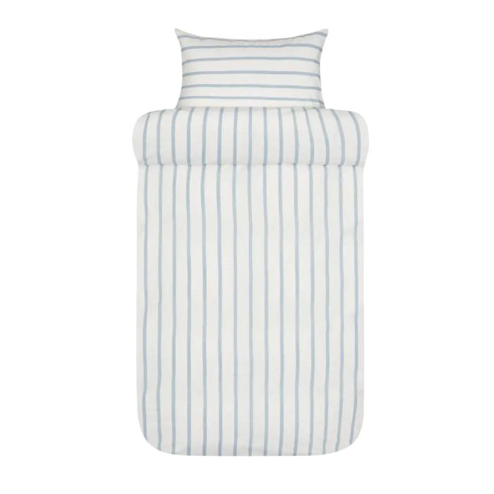Dette stribet sengetøj er produceret af 100% blød bomuld med vævningsmetoden Bæk og bølge, også kaldet bomuldskrepp. Denne vævning giver rynkeeffekten og gør at der skabes hulrum til små luftlommer i materialet, som gør at sengetøjet føles let, luftig og ofte køligere end andre typer af materialer. Om sommeren vil sengetøjet føles luftigt, og om vinteren vil du kunne mærke varmen fra den bløde bomuld, hvilket er en den unikke fordel som denne skønne kombination af materiale og vævning giver. Sengesættet bør ikke stryges, idet det har sine luftlummer i selve vævningen. Sengelinned med denne vævningstype er særligt god til dig som til tider oplever at have det varmt om natten, her kan sengetøjet tilføje øget åndbarhed og høj absorbering.